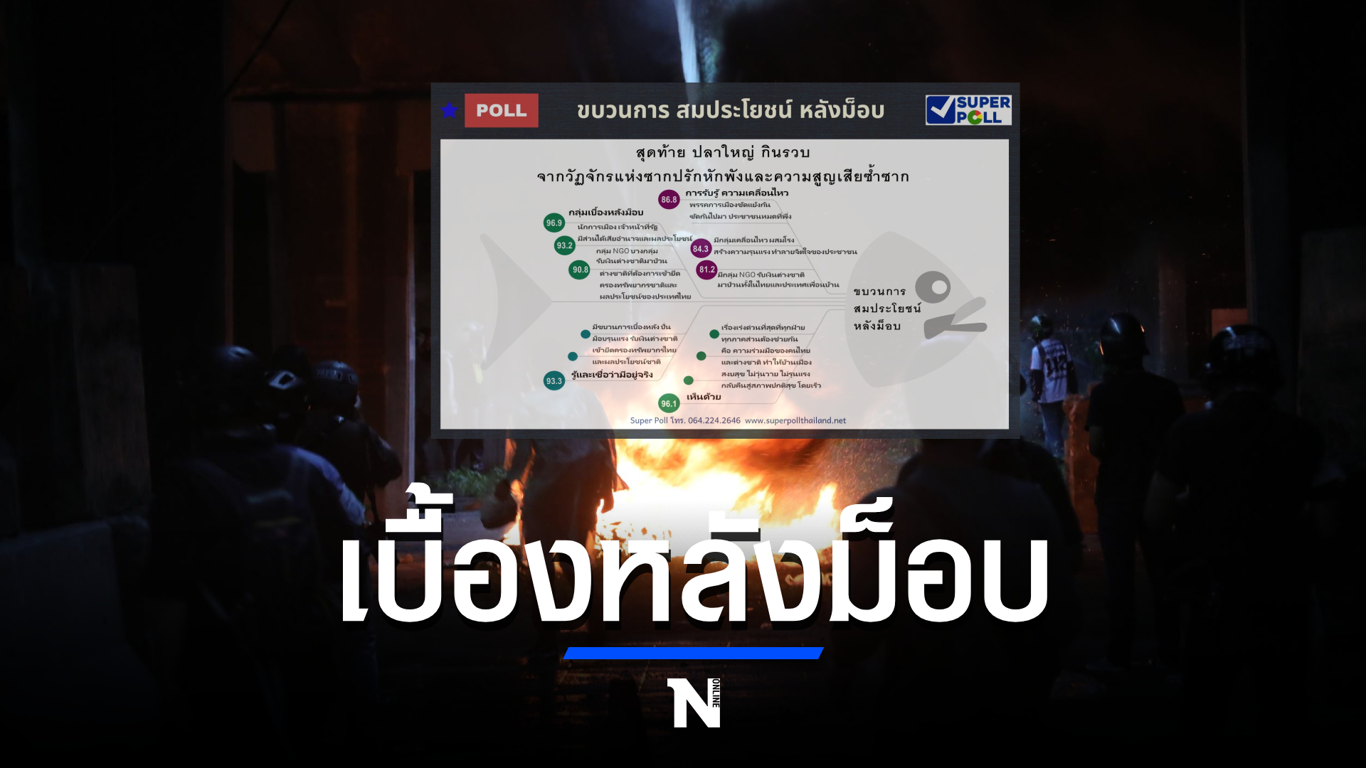 โดยประเด็นแรก ซึ่งเป็นคำถามปลายเปิด คือ ใครอยู่เบื้องหลังม็อบที่เกิดความรุนแรงบานปลาย ผลสำรวจพบว่า ประชาชนกลุ่มตัวอย่างส่วนใหญ่ หรือ ร้อยละ 96.9 เชื่อว่า นักการเมืองและเจ้าหน้าที่รัฐบางคนที่มีส่วนได้ส่วนเสียกับอำนาจและผลประโยชน์ เป็นผู้อยู่เบื้องหลัง
