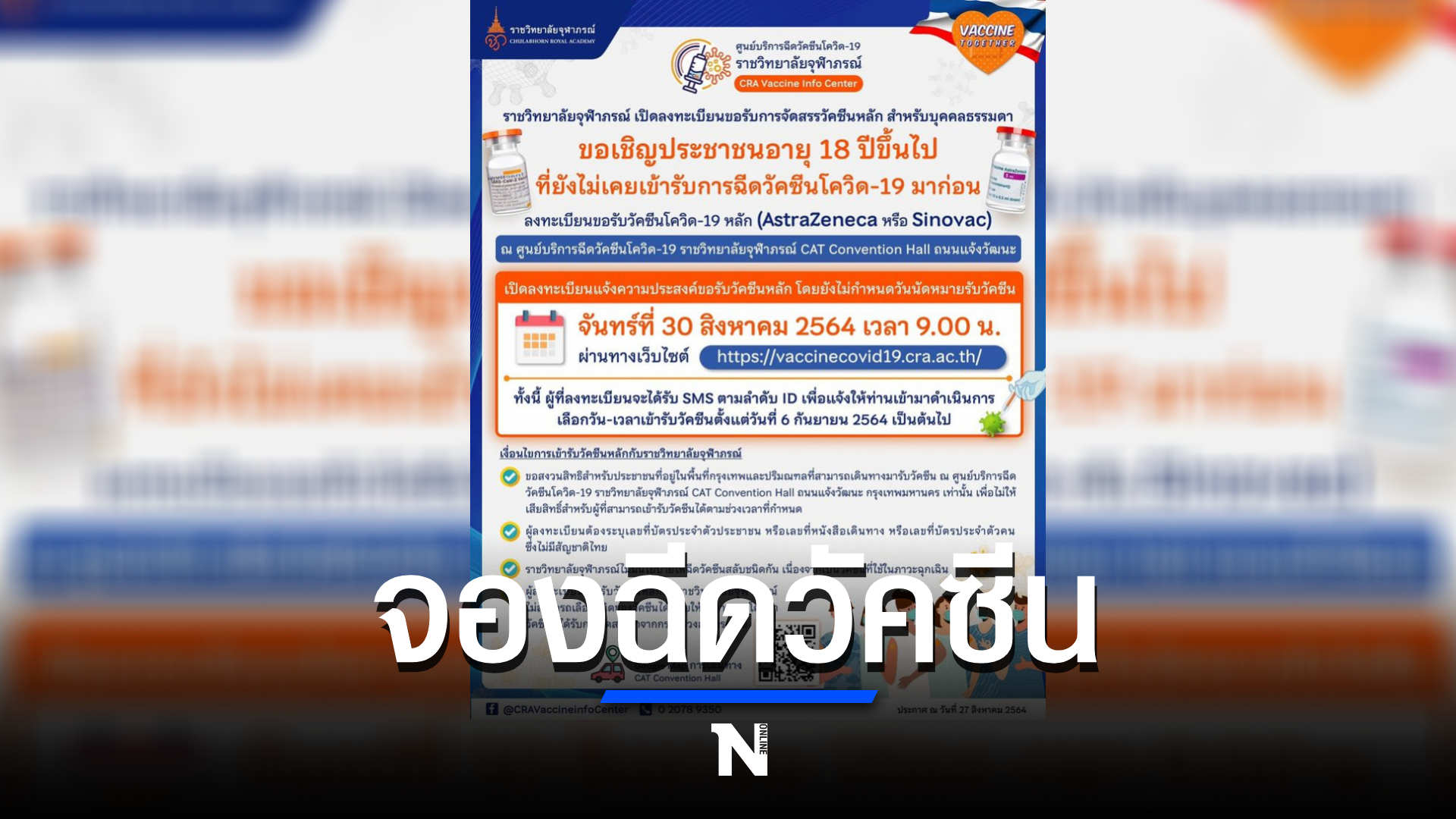 ขอสงวนสิทธิ์สำหรับประชาชนที่อยู่ในพื้นที่กรุงเทพและปริมณฑล ที่สามารถเดินทางมารับวัคซีน ณ ศูนย์บริการฉีดวัคซีนโควิด-19 ราชวิทยาลัยจุฬาภรณ์ CAT Convention Hall ถนนแจ้งวัฒนะ กรุงเทพมหานคร เท่านั้น เพื่อไม่ให้เสียสิทธิ์สำหรับผู้ที่สามารถเข้ารับวัคซีนได้ตามช่วงเวลาที่กำหนด ผู้ลงทะเบียนต้องระบุเลขที่บัตรประจำตัวประชาชน หรือเลขที่หนังสือเดินทาง หรือเลขที่บัตรประจำตัวบุคคลที่ไม่มีสัญชาติไทย