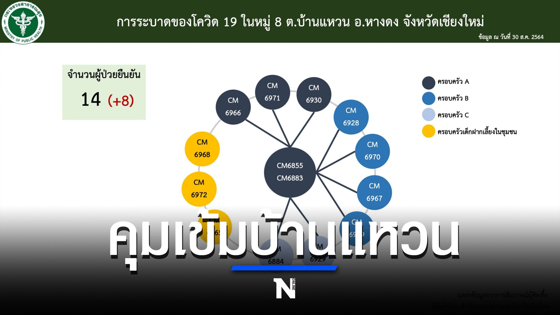 จากข้อมูลเมื่อวันที่ 30 สิงหาคม 2564 จังหวัดเชียงใหม่พบคลัสเตอร์เพิ่มเติมที่ ครอบครัวหมู่ 8 ตำบลบ้านแหวน อำเภอหางดงจำนวน 8 ราย รวมผู้ติดเชื้อสะสม 14 ราย โดยการติดเชื้อเริ่มจากภายในครอบครัว ก่อนที่จะขยายไปสู่ครอบครัวอื่นที่ใกล้ชิดกัน ผู้ติดเชื้อที่พบใหม่ 2 ราย เป็นคนรับจ้างดูแลลูกของแรงงานต่างด้าวที่พักอยู่ละแวกนั้น ซึ่งจากการตรวจเชิงรุกพบเด็กต่างด้าวและพ่อ-แม่ รวม 3 ราย ติดเชื้อ นอกจากนี้ยังได้มีการกระจายเชื้อไปสู่คนในครอบครัวที่อยู่ละแวกบ้านเดียวกันอีก 2 ราย ซึ่งในวันที่ 31 สิงหาคม 2564 จะได้มีการลงพื้นที่ตรวจเชิงรุกในชุมชน เนื่องจากมีแรงงานต่างด้าวพักอาศัยอยู่จำนวนมาก