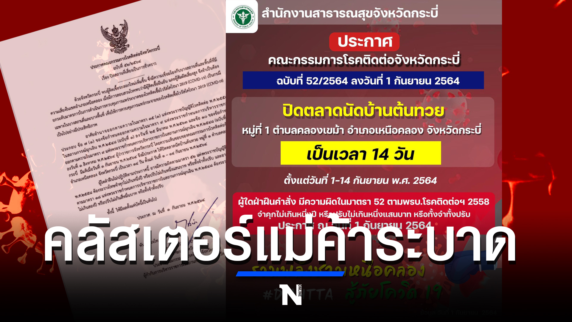 2 กันยายน 2564 ที่จ.กระบี่ สำนักงานสาธารณสุขจังหวัดกระบี่ ประกาศคณะกรรมการโรคติดต่อจังหวัดกระบี่ ฉบับที่ 52 / 2564 ลงวันที่ 1 กันยายน 2564 ปิดตลาดนัดบ้านต้นทวยหมู่ที่ 1 ตำบลคลองเขม้า อำเภอเหนือคลอง จังหวัดกระบี่เป็นเวลา 14 วัน ตั้งแต่วันที่ 1-14 กันยายน พ.ศ. 2564 ผู้ใดฝ่าฝืนคำสั่ง มีความผิดในมาตรา 52 ตามพรบ.โรคติดต่อฯ 2558 จำคุกไม่เกินหนึ่งปี หรือปรับไม่เกินหนึ่งแสนบาท หรือทั้งจำทั้งปรับ