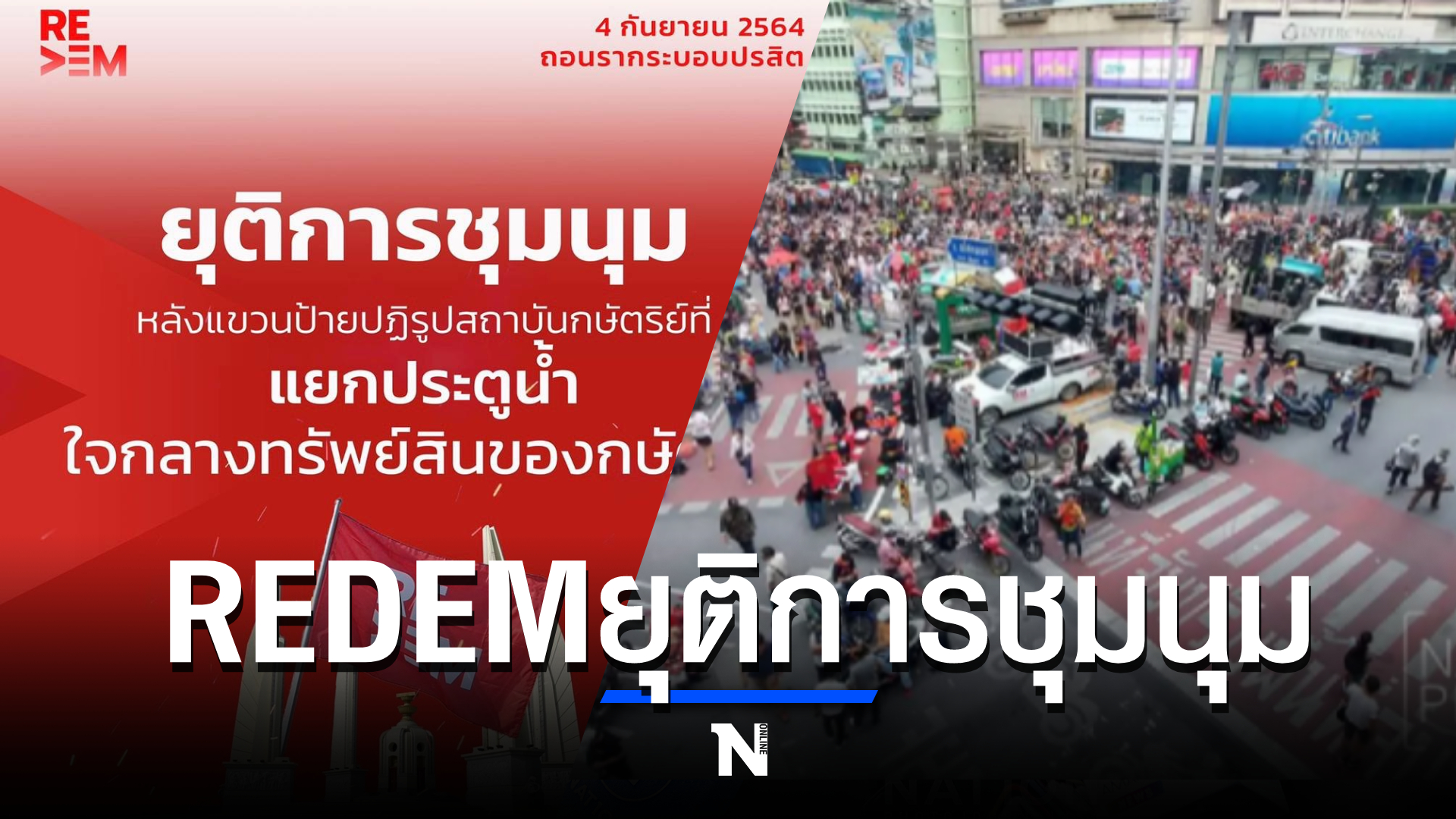 เวลา 18.20 น. นายธนัตถ์ ธนากิจอำนวย ปราศรัยถึงเหตุผลข้อเรียกร้องกานชุมนุม ก่อนที่จะเป็นตัวแทนกลุ่มรีเด็ม ประกาศยุติการชุมนุม หลังแขวนป้ายข้อเรียกร้องที่มีข้อความ ‘ปฏิรูปสถาบัน บนิเวณแยกประตูน้ำ