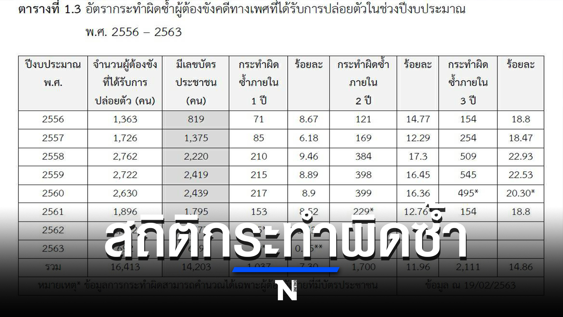 กรมราชทัณฑ์ ซึ่งเป็นงานวิจัยกรณีผู้ต้องขังคดีเพศปล่อยตัวไปและกลับมาทำผิดซ้ำรายปี โดยเป็นการเก็บสถิติของนักโทษเด็ดขาดที่กระทำผิดคดีเกี่ยวกับเพศ (กรณีที่คดีสิ้นสุดแล้ว) สำหรับ กรณีความผิดเกี่ยวกับเพศ มีนักโทษเด็ดขาดในคดีนี้ แบ่งเป็นเพศชาย 7,753 ราย และเพศหญิง 205 ราย (บางคนอาจจะงงว่า ทำไมมีผู้หญิงด้วย ก็คือ จะเป็นนักโทษเด็ดขาดคดีทางเพศ เช่น เป็นแม่เล้า) โดยตัวเลขสถิตินี้เป็นการสรุปในช่วงต้นปี 2564 จนถึงวันที่ 1 กันยายน 2564 ขณะที่การเก็บสถิติย้อนหลังตั้งแต่ปี 2556 – 2563 กรมราชทัณฑ์ ได้มีการบันทึกอัตราการกระทำผิดซ้ำผู้ต้องขังคดีทางเพศ ที่ได้รับการปล่อยตัวไปแล้ว มีดังนี้