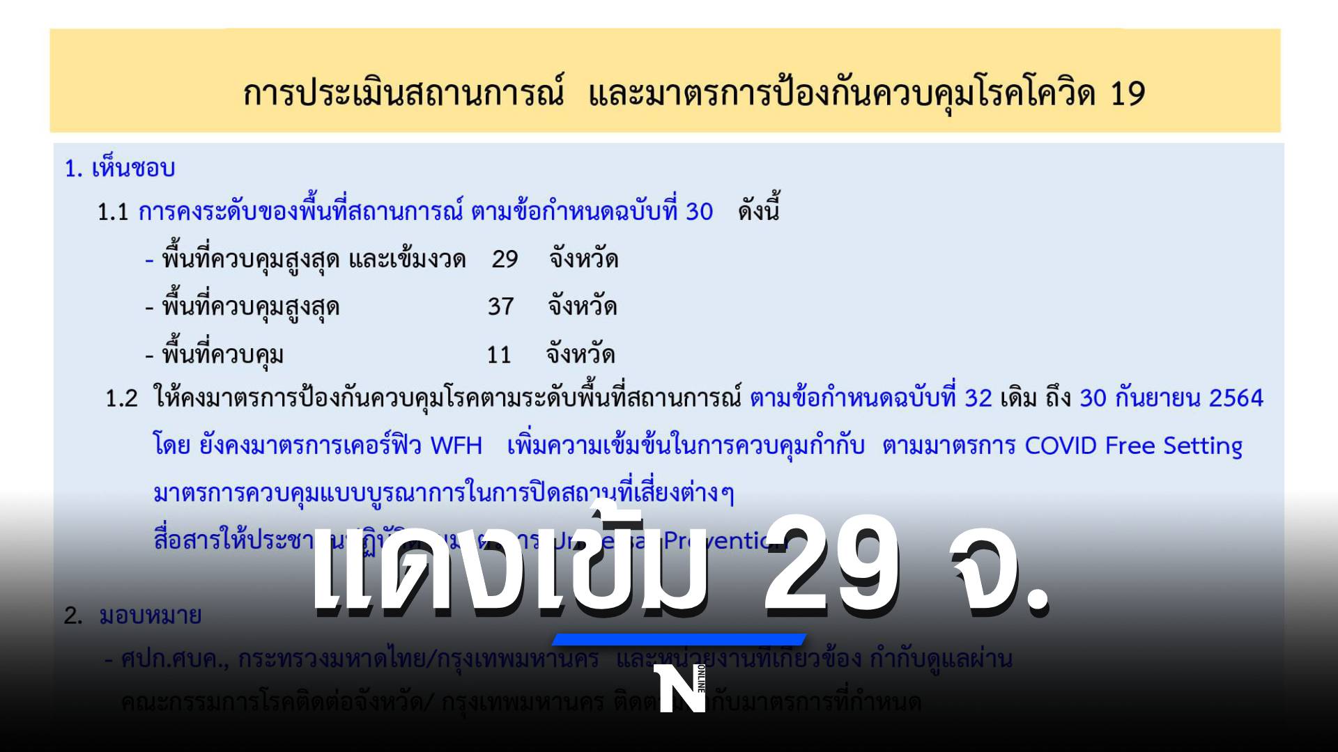 นพ.ทวีศิลป์ วิษณุโยธิน โฆษกศูนย์บริหารสถานการณ์การแพร่ระบาดของโรคโควิด-19 แถลงผลการประชุม ศบค. ชุดใหญ่ ว่า ที่ประชุมยังให้คงสถานการณ์ในพื้นที่ ตามโซนสีโดยพื้นที่ควบคุมสูงสุดและเข้มงวด (สีแดงเข้ม) คงไว้ที่ 29 จังหวัด , พื้นที่ควบคุมสูงสุด (สีแดง) 37 จังหวัด และพื้นที่ควบคุม (สีส้ม) 11 จังหวัด และให้คงมาตรการป้องกันควบคุมโรคตามระดับพื้นที่ตามข้อกำหนดฉบับที่ 32 จนถึง 30 กันยายน 2564