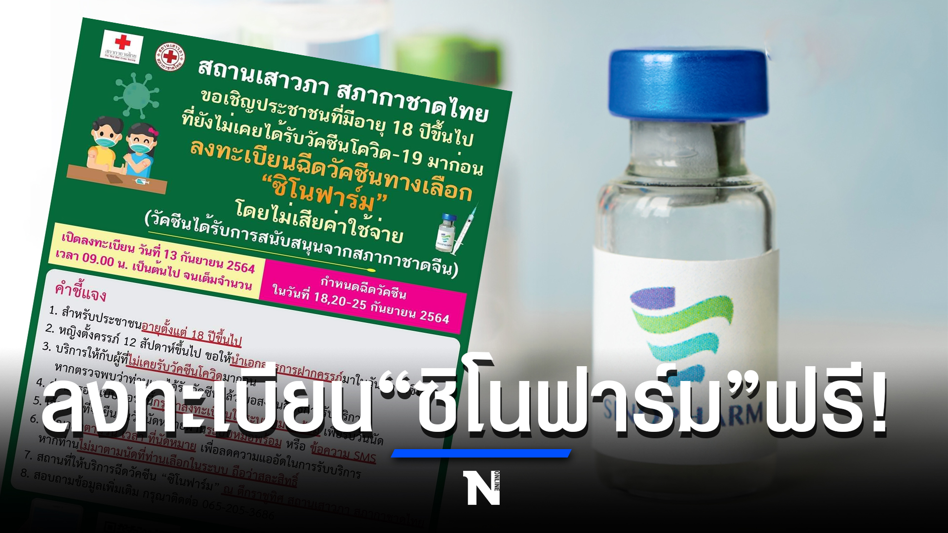 13 กันยายน 2564 สภากาชาดไทย เปิดลงทะเบียนฉีดวัคซีน "ซิโนฟาร์ม" ที่ได้รับการสนับสนุนจากสภากาชาดจีนฟรี! สำหรับประชาชนที่มีอายุ 18 ปีขึ้นไป และหญิงตั้งครรภ์ 12 สัปดาห์ขึ้นไป ที่ยังไม่เคยได้รับวัคซีน โควิด19 มาก่อน