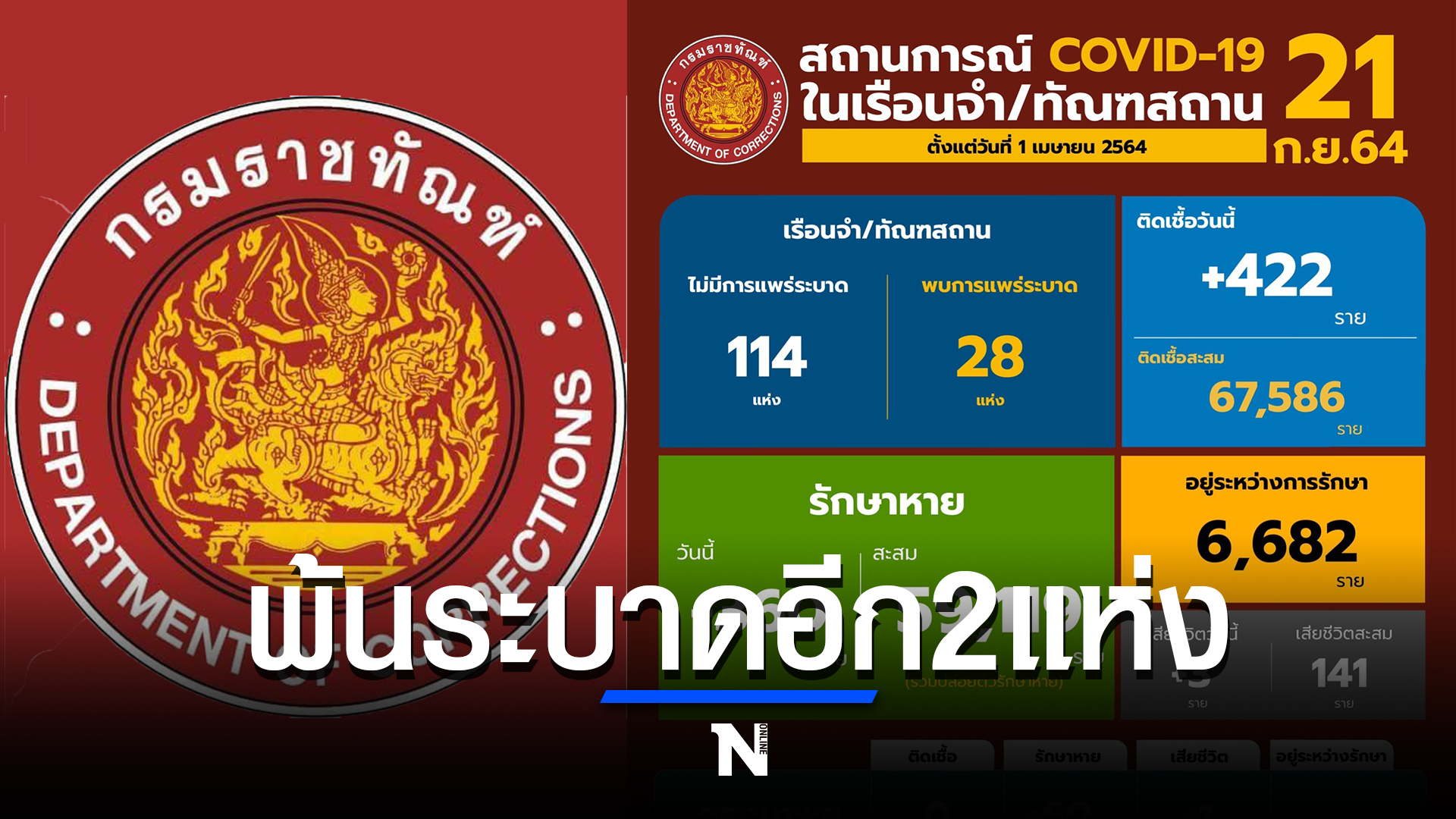 21 กันยายน 2564 21 กันยายน 2564 เวลา 12.00 น. นายอายุตม์ สินธพพันธุ์ อธิบดีกรมราชทัณฑ์ เปิดเผยถึงสถานการณ์การแพร่ระบาดของโรคติดเชื้อไวรัสโควิด-19 ในเรือนจำและทัณฑสถาน (ข้อมูล ณ วันที่ 20 กันยายน 2564 เวลา 16.00 น.) พบผู้ติดเชื้อรายใหม่ 422 ราย (พบในเรือนจำสีแดง 406 ราย และพบในห้องแยกกักโรคผู้ต้องขังรับใหม่ 16 ราย) รักษาหายเพิ่ม 360 ราย เสียชีวิต 3 ราย ทำให้มีผู้ติดเชื้อที่ยังอยู่ในการดูแลของกรมราชทัณฑ์ 6,682 ราย (กลุ่มสีเขียว 87.3% สีเหลือง 12.4% และสีแดง 0.3%) เป็นพื้นที่กรุงเทพมหานคร 398 ราย (รวมทัณฑสถานโรงพยาบาลราชทัณฑ์) ปริมณฑล 119 ราย และต่างจังหวัด 6,165 ราย