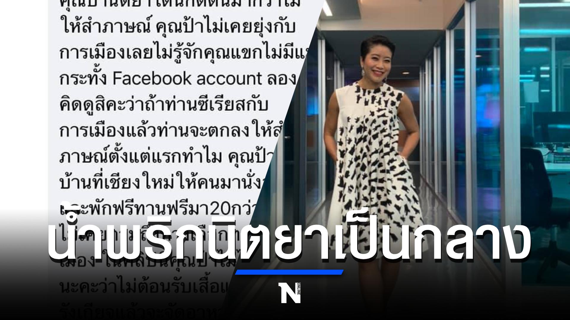 “ในคลิปนี้คุณป้าไม่ได้พูดเลยนะคะว่า ไม่ต้อนรับเสื้อแดง ถ้ารังเกียจแล้วจะจัดอาหารรับรองไว้ให้ทำไม ขอร้องว่าอย่ากล่าวหาท่านผิดๆ ท่านอาจแยกไม่ออก ตามที่ได้ยินมาว่ารายการของคุณแขก เป็น lifestyle TV หรือ political TV กันแน่ ซึ่งคุณป้าเห็นตามสมควรแล้วว่า ควรทำตัวเป็นกลาง ซึ่งทำให้ทุกๆ คนเข้าใจผิด แล้วกลายเป็นดราม่าของสังคม”