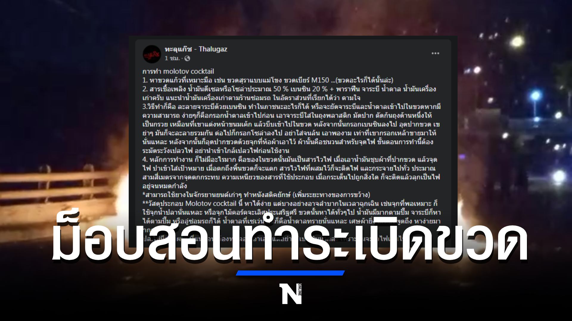 หลังเกิดเหตุ ทางเพจเฟซบุ๊ก “ทะลุแก๊ซ – Thalugaz” โพสตืสอนวิธีการทำระเบิดขวดว่า การทำ molotov cocktail