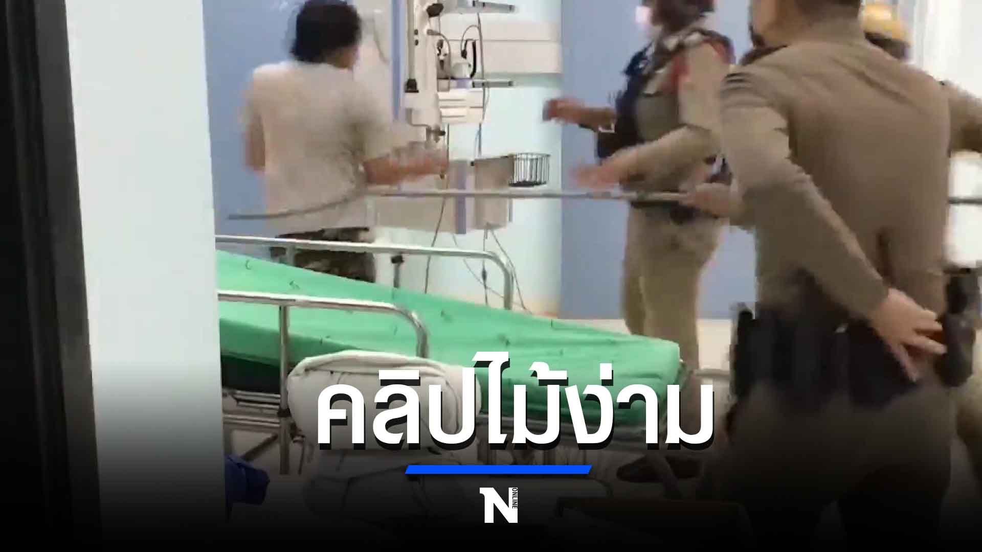 ซึ่งตามคลิป เป็นชายลักษณะผมยาวประบ่า สวมเสื้อสีเทา กางเกงขาสั้น รองเท้าเตะ มีท่าทีต่อต้านเจ้าหน้าที่ จับอุปกรณ์ทางการแพทย์เหวี่ยงไปมา พูดจาหยาบคายโต้ตอบกับเจ้าหน้าที่ผู้หญิงคนหนึ่ง (เสื้อสีน้ำเงิน) อยู่พักหนึ่ง จากนั้นไม่นานเจ้าหน้าที่ตำรวจ ฝ่ายปกครอง สห.และตชด ได้ใช้ยุทธวิธีไม้สามง่ามเข้าควบคุบตัวได้สำเร็จ ตรวจสอบเบื้องต้นไม่พบทรัพย์สินของโรงพยาบาลเสียหาย