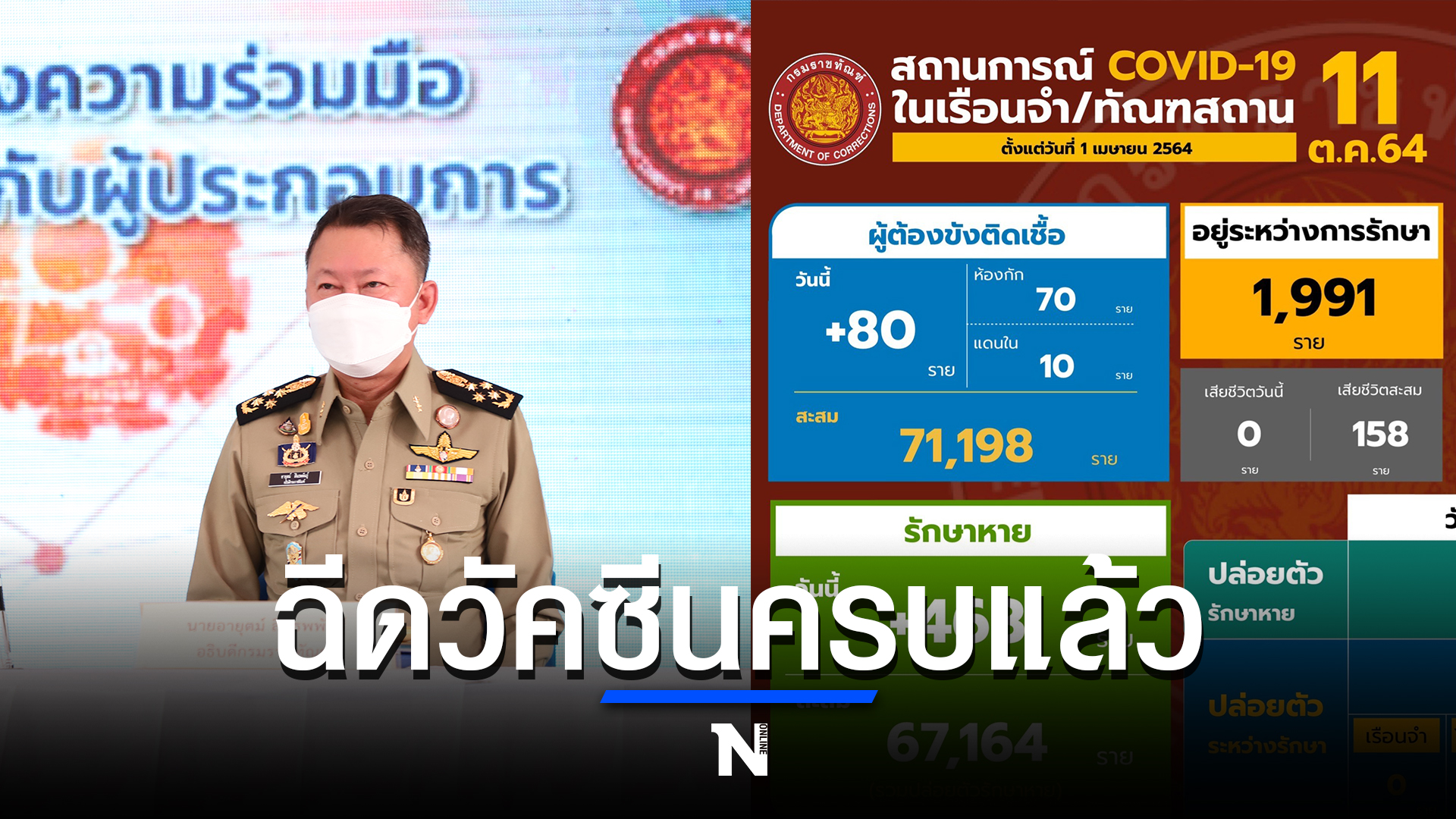 ทั้งนี้ ปัจจุบัน กรมราชทัณฑ์ได้ฉีดวัคซีนแก่ผู้ต้องขังไปแล้วทั้งสิ้น 263,301 โดส เพิ่มขึ้นจากเมื่อวาน 17,832 โดส แบ่งเป็นการฉีดวัคซีนแก่ผู้ต้องขังเข็มที่ 1 จำนวน 201,299 ราย เข็มที่ 2 จำนวน 62,002 ราย ดังนั้น ถือว่าผู้ต้องขังกลุ่มเป้าหมายที่จะต้องได้รับวัคซีนเข็มแรกได้รับวัคซีนครบทุกรายเป็นที่เรียบร้อยแล้ว เนื่องจากผู้ต้องขังในส่วนที่เหลือเป็นกลุ่มที่อยู่ในเรือนจำแพร่ระบาด รวมถึงผู้ติดเชื้อที่รักษาหายแล้ว ซึ่งยังไม่สามารถรับวัคซีนเข็มแรกได้ในขณะนี้ ต้องรอการฉีดวัคซีนเพื่อกระตุ้นภูมิคุ้มกันโรคอีกครั้งตามระยะเวลา โดยคาดว่าจะสามารถดำเนินการได้พร้อมกับการเริ่มฉีดวัคซีนเข็มที่ 2 ในกลุ่มที่ได้รับเข็มแรกไปแล้ว ในช่วงปลายเดือนตุลาคมนี้เป็นต้นไป