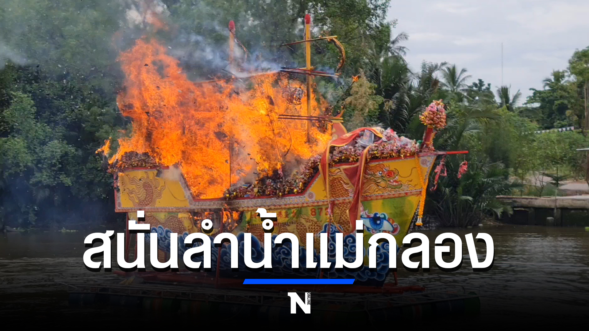 ชาวไทยเชื้อสายจีนนุ่งห่มขาวร่วมพิธีเผาเรือสำเภามังกร สวยงามและใหญ่ที่สุดในจังหวัดสมุทรสงคราม พร้อมเครื่องบูชาประทัดดังสนั่นกลางลำน้ำแม่กลอง ส่งเทพเจ้ากิ้วฮ้วงฮุกโจ้วขึ้นสวรรค์ เป็นอันสิ้นสุดเทศกาลถือศีลกินเจ