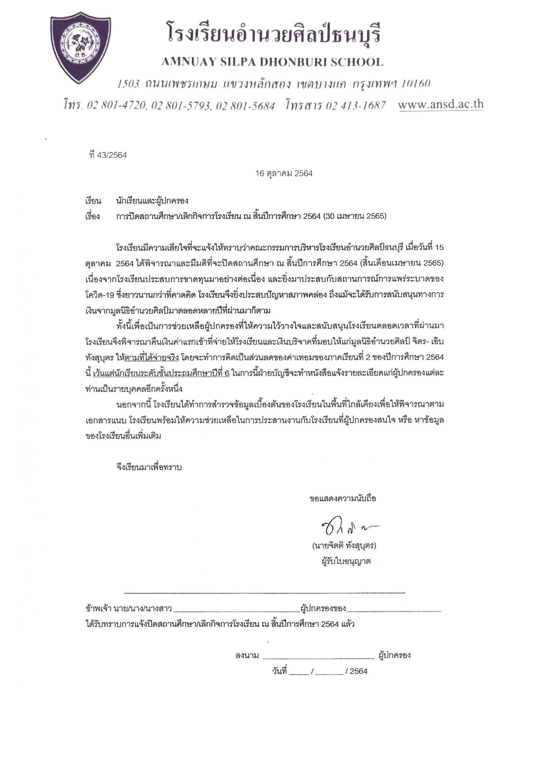 เนื้อหาในหนังสือระบุว่า โรงเรียนมีความเสียใจที่จะแจ้งให้ทราบว่า คณะกรรมการบริหารโรงเรียนอํานวยศิลป์ธนบุรี เมื่อวันที่ 15 ต.ค.ได้พิจารณา และมีมติที่จะปิดสถานศึกษา ณ สิ้นปีการศึกษา 2564 (สิ้นเดือน เม.ย.2565)