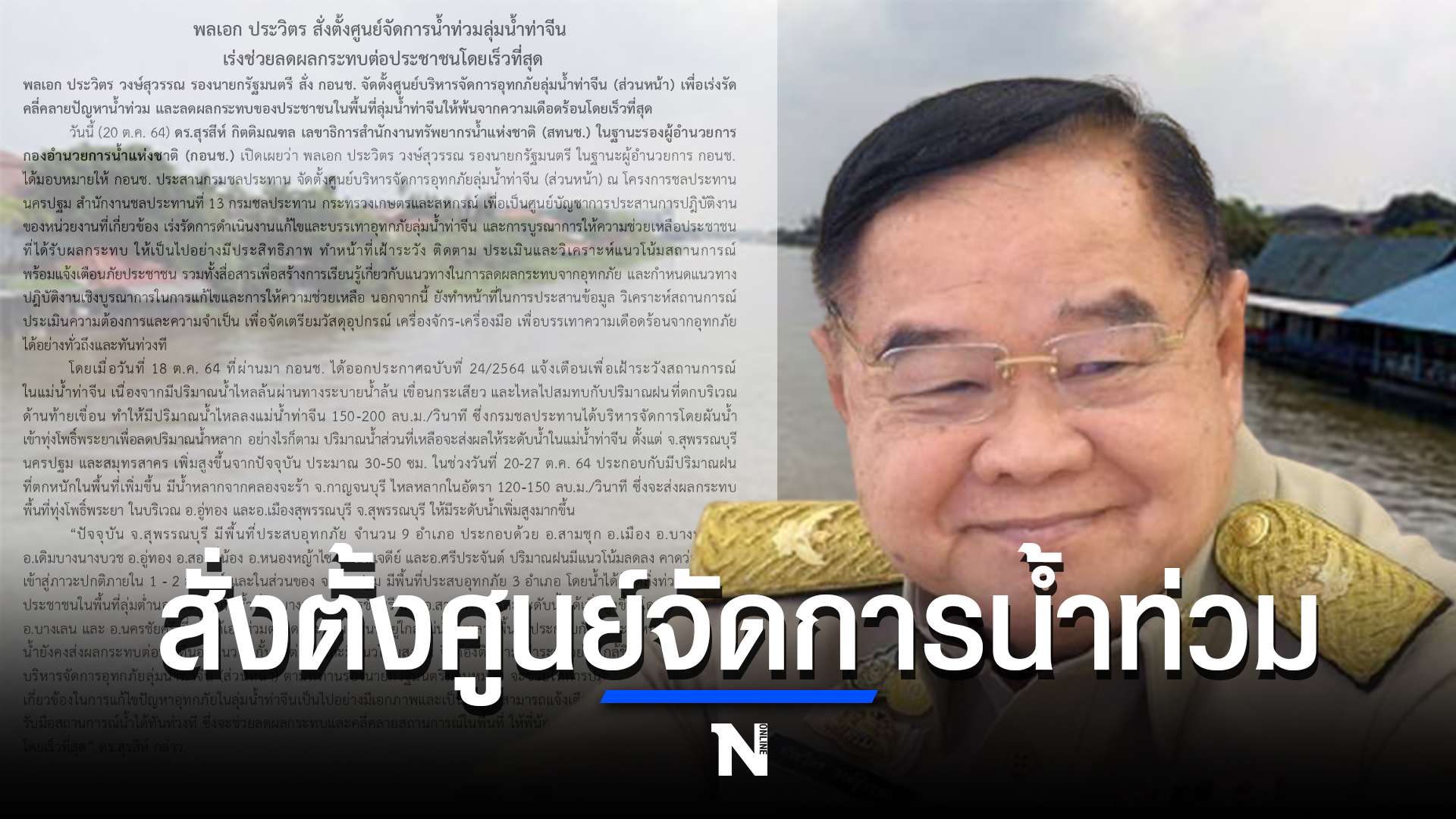 20 ตุลาคม 2564 ดร.สุรสีห์ กิตติมณฑล เลขาธิการสำนักงานทรัพยากรน้ำแห่งชาติ (สทนช.) ในฐานะรองผู้อำนวยการกองอำนวยการน้ำแห่งชาติ (กอนช.) เปิดเผยว่า พลเอก ประวิตร วงษ์สุวรรณ รองนายกรัฐมนตรี ในฐานะผู้อำนวยการ กอนช. ได้มอบหมายให้ กอนช. ประสานกรมชลประทาน จัดตั้งศูนย์บริหารจัดการอุทกภัยลุ่มน้ำท่าจีน (ส่วนหน้า) ณ โครงการชลประทานนครปฐม สํานักงานชลประทานที่ 13 กรมชลประทาน กระทรวงเกษตรและสหกรณ์ เพื่อเป็นศูนย์บัญชาการประสานการปฎิบัติงานของหน่วยงานที่เกี่ยวข้อง เร่งรัดการดําเนินงานแก้ไขและบรรเทาอุทกภัยลุ่มน้ำท่าจีน และการบูรณาการให้ความช่วยเหลือประชาชนที่ได้รับผลกระทบ