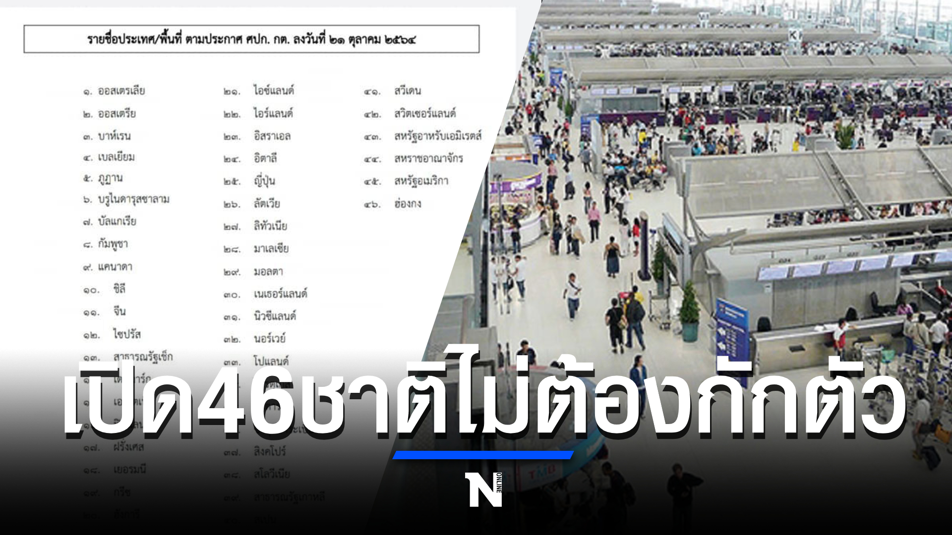 กรณีที่ พล.อ.ประยุทธ์ จันทร์โอชา นายกรัฐมนตรีและรัฐมนตรีว่าการกระทรวงกลาโหม เปิดเผยผ่านเพจเฟซบุ๊กช่วงค่ำวันที่ 21 ตุลาคม กรณีการเปิดประเทศวันที่ 1 พฤศจิกายน 2564 จากเดิมจะพิจารณาให้นักท่องเที่ยวประมาณ 10 ประเทศ เดินทางเข้าไทยได้โดยไม่ต้องกักตัว ล่าสุด ได้ปรับเป็น 46 ประเทศ เพื่อกระตุ้นภาคการท่องเที่ยวและภาคธุรกิจอื่นๆ ที่เกี่ยวข้อง (อ่านรายละเอียด)