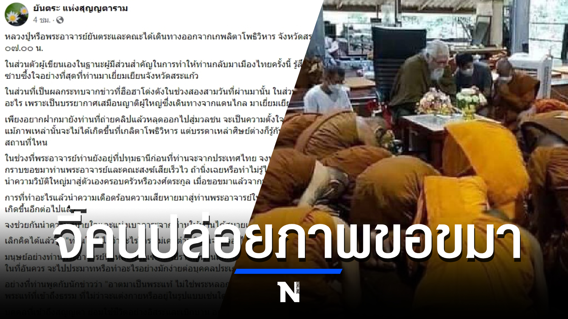 เพียงอยากฝากมายังท่านที่ถ่ายคลิปแล้วหลุดออกไปสู่มวลชน จะเป็นความตั้งใจหรือไม่รู้เท่าถึงการณ์ก็ตาม แม้ภาพเหล่านั้นจะไม่ได้เกิดขึ้นที่เกลิตาโพธิวิหาร แต่บรรดาเหล่าศิษย์ต่างก็รู้กันดีว่าเหตุการณ์เหล่าเกิดขึ้นสถานที่ไหน ในช่วงที่พระอาจารย์ท่านยังอยู่ที่ปทุมธานีก่อนที่ท่านจะจากประเทศไทย จงหาโอกาสเอาพานธูปเทียนแพไปกราบขอขมาท่านพระอาจารย์และคณะสงฆ์เสียเร็วไว ถ้านิ่งเฉยหรือทำไม่รู้ไม่ชี้จะต้องพบกับความเสียใจ อาจนำความวิบัติใหญ่มาสู่ตัวเองครอบครัวหรือวงศ์ตระกูล เมื่อขอขมาแล้วจากหนักก็จะผ่อนเป็นเบา