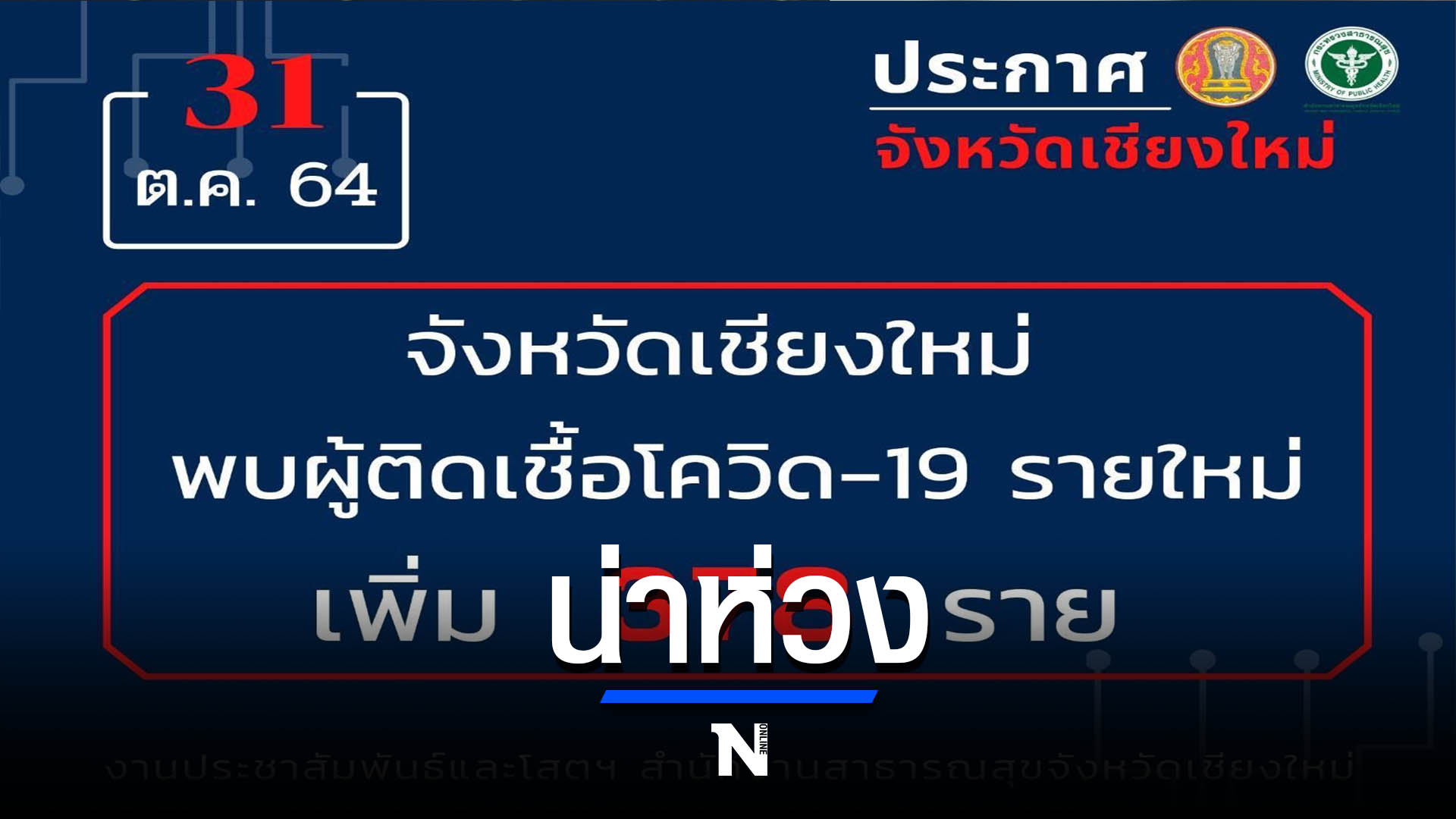 วันที่ 31 ตุลาคม 2564 สถานการณ์การแพร่ระบาดโรคโควิด-19 จังหวัดเชียงใหม่ พบผู้ติดเชื้อรายใหม่เพิ่ม 378 ราย โดยเป็นผู้ติดเชื้อในจังหวัด 373 ราย อีก 5 ราย เป็นผู้ติดเชื้อจากต่างจังหวัด ทำให้ยอดผู้ติดเชื้อสะสมตั้งแต่เดือนกรกฎาคม 2564 จนถึงปัจจุบัน อยู่ที่ 12,582 ราย ยังคงรักษาตัวอยู่ในโรงพยาบาลทุกประเภท จำนวน 4,152 ราย แยกเป็นโรงพยาบาลสนามจังหวัดเชียงใหม่ 188 ราย โรงพยาบาลสนามเฉพาะกิจ 110 ราย Community Isolation (CI) 2,243 ราย Home Isolation (HI) 96 ราย Hospitel 166 ราย โรงพยาบาลรัฐ 509 ราย โรงพยาบาลเอกชน 770 ราย และโรงพยาบาลต่างจังหวัด 70 ราย