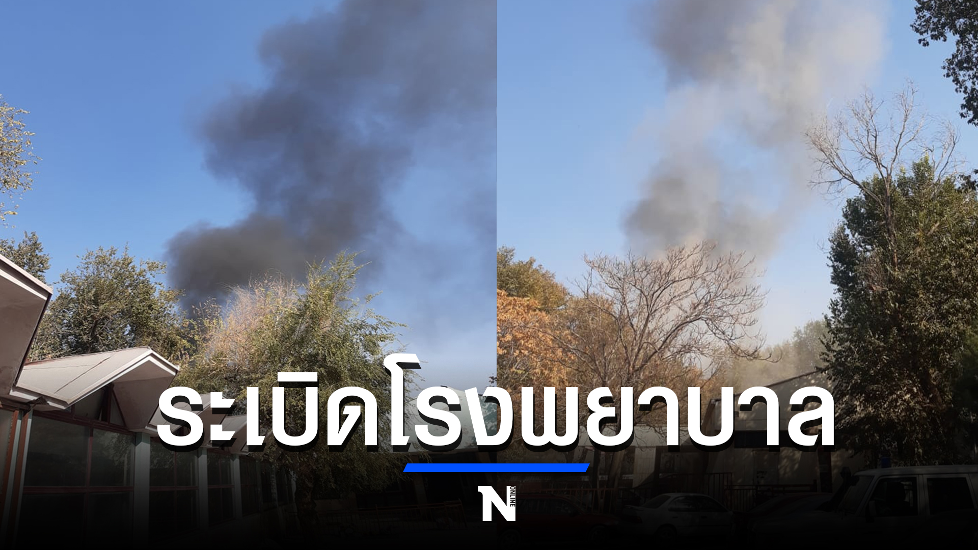ภาพเหตุการณ์ที่ชาวบ้านแชร์ในโซเชียลเผยให้เห็นกลุ่มควันในจุดเกิดเหตุระเบิดที่โรงพยาบาลทหารแห่งใหญ่ที่สุดของของอัฟกานิสถานในย่าน วาซีร์ อัคบาร์ ข่าน ซึ่งเคยเป็นสถานที่ตั้งของสถานทูตต่างๆ