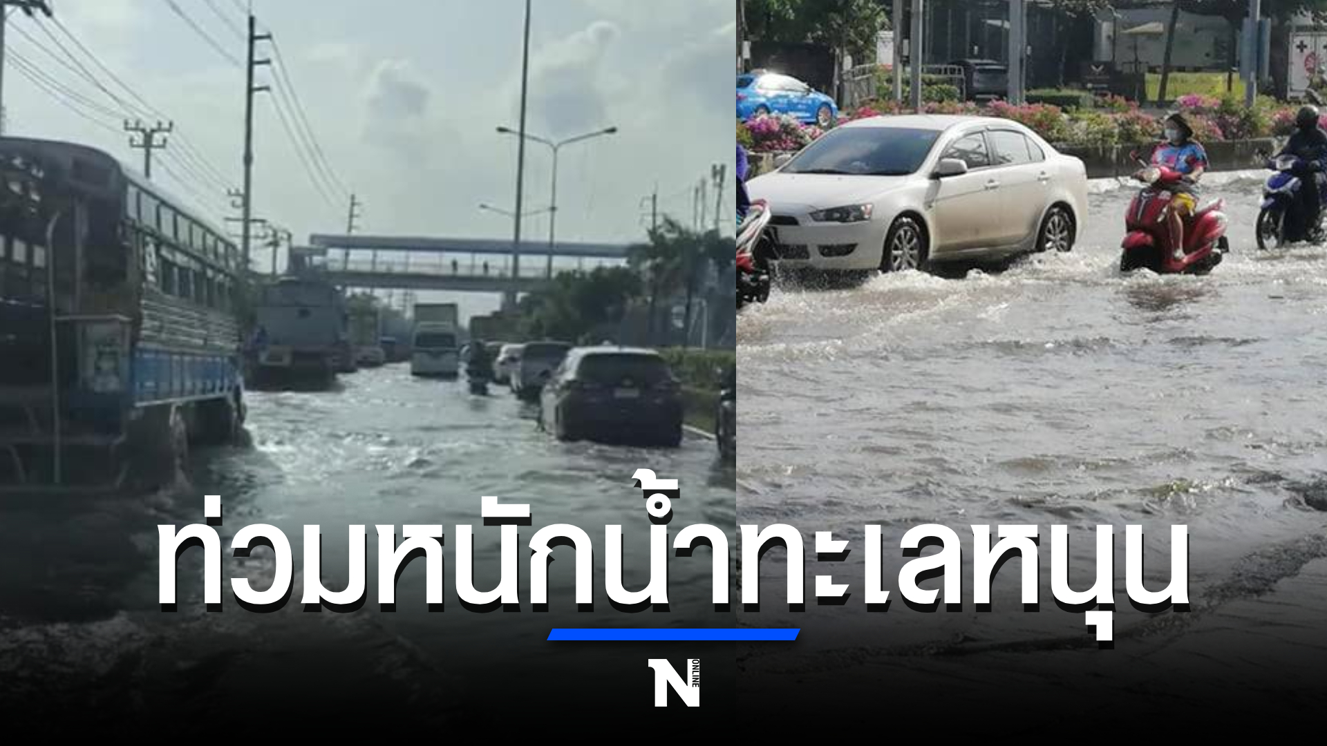 08.49 น. ถนนสุขุมวิท ตั้งแต่วัดราษฎร์บำรุง ไปจนถึงศาลเยาวชนและครอบครัวจังหวัดสมุทรปราการ น้ำทะเลหนุนสูง กำลังทะลักไหลเข้าท่วมถนนทุกช่องทาง รถเล็กผ่านลำบากแล้ว