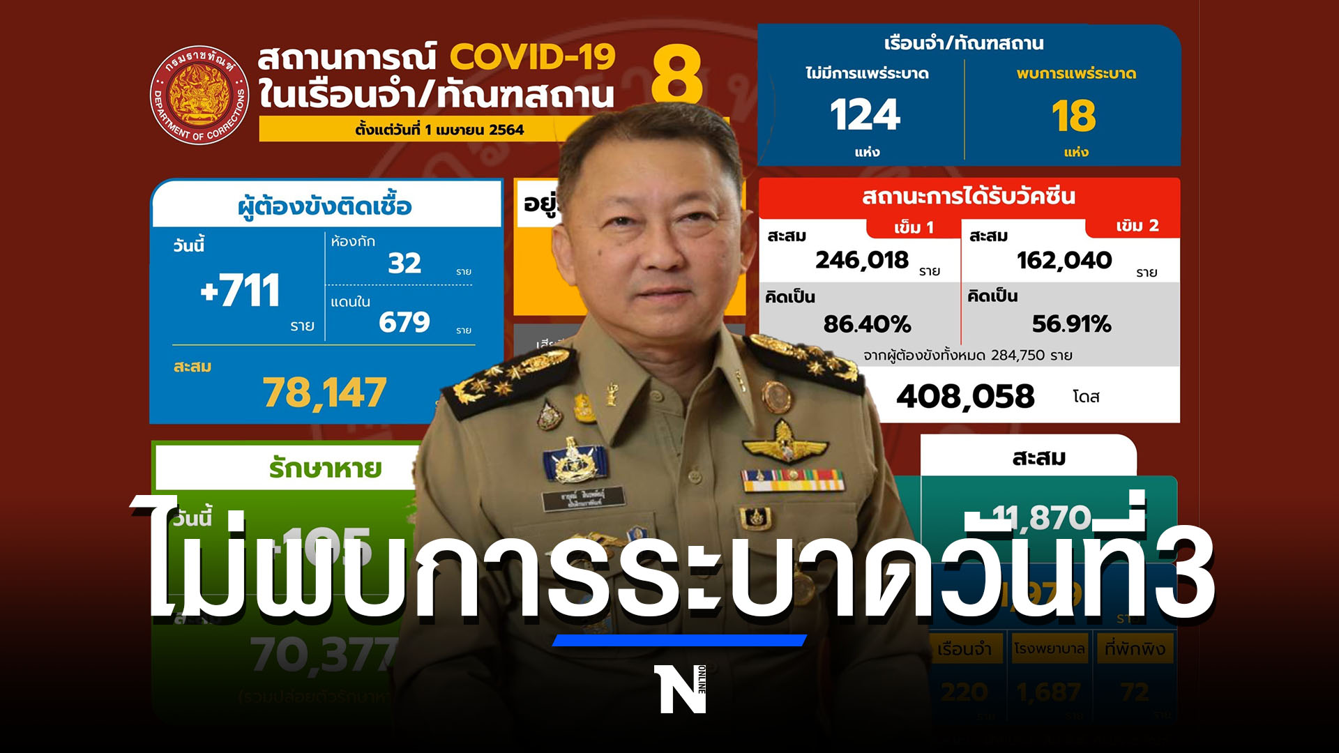นายอายุตม์ กล่าวว่า ในวันนี้ สถานะเรือนจำยังคงที่ ไม่พบเรือนจำระบาดใหม่ต่อเนื่องเป็นวันที่ 3 จึงมีจำนวนเรือนจำสีขาวอยู่ที่ 124 แห่ง และเรือนจำสีแดง 18 แห่งคงเดิม โดยในจำนวนดังกล่าว เป็นเรือนจำที่ยังอยู่ระหว่างควบคุมการระบาดเพียง 4 แห่ง (ระบาดใหม่ 3 แห่ง คือ ทัณฑสถานหญิงนครราชสีมา เรือนจำกลางนครราชสีมา และเรือนจำจังหวัดชุมพร และระบาดซ้ำ 1 แห่ง คือ เรือนจำจังหวัดสุพรรณบุรี) ขณะที่มีเรือนจำที่สามารถลดการระบาดและอยู่ในแผนสิ้นสุดการระบาดของโรค หรือ EXIT แล้วทั้งสิ้น 14 แห่ง ซึ่งจะเริ่มทยอยพ้นจากการระบาดอย่างต่อเนื่องตั้งแต่วันที่ 11 พฤศจิกายนเป็นต้นไป ส่วนการบริหารจัดการวัคซีนแก่ผู้ต้องขัง ปัจจุบัน กรมราชทัณฑ์ได้ดำเนินการฉีดวัคซีนแก่ผู้ต้องขังไปแล้วทั้งสิ้น 408,058 โดส แบ่งเป็นการฉีดวัคซีนแก่ผู้ต้องขังเข็มที่ 1 จำนวน 246,018 ราย และเข็มที่ 2 จำนวน 162,040 ราย