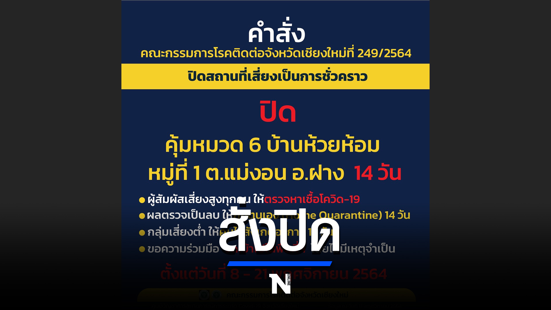 นายประจญ ปรัชญ์สกุล ผู้ว่าราชการจังหวัดเชียงใหม่ ในฐานะประธานคณะกรรมการโรคติดต่อจังหวัดเชียงใหม่ ผู้กำกับการบริหารราชการในสถานการณ์ฉุกเฉินจังหวัดเชียงใหม่ ลงนามคำสั่งคณะกรรมการโรคติดต่อจังหวัดเชียงใหม่ โดยสั่งปิดบ้านห้วยห้อม (คุ้มหมวด 6) หมู่ที่ 1 ต.แม่งอน และบริษัท เชียงรายฟูด จำกัด หมู่ที่ 7 ต.แม่งอน อ.ฝาง จ.เชียงใหม่ เป็นเวลา 14 วัน ระหว่างวันที่ 8 - 21 พฤศจิกายน 2564 เพื่อให้การควบคุมและป้องกันโรคในพื้นที่ อ.ฝาง ภายหลังพบการติดเชื้อเป็นกลุ่มก้อน