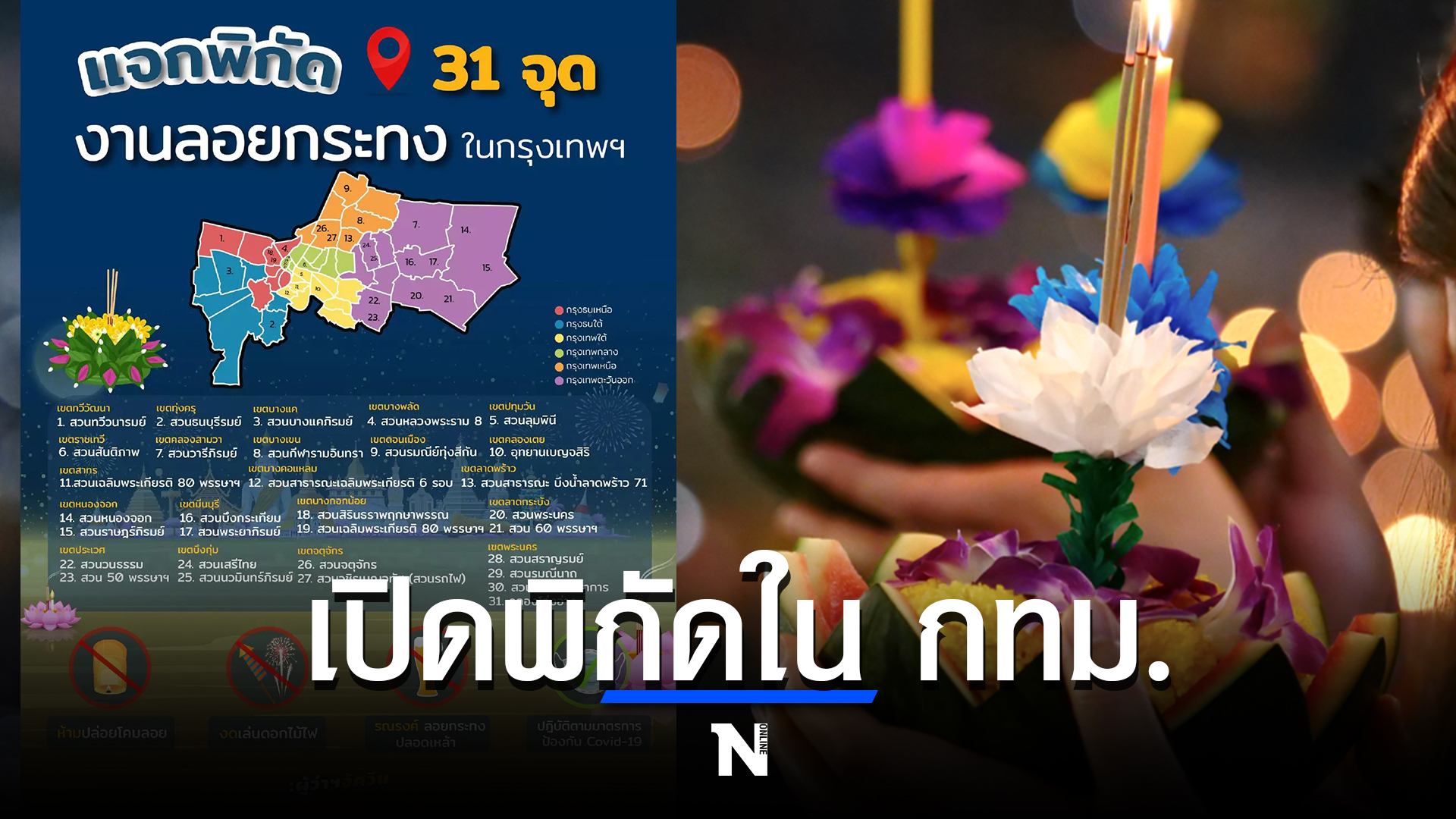 สำหรับคนที่อยากลอยกระทงใกล้ ๆ บ้าน กทม. ได้เปิดสวนสาธารณะให้ประชาชนได้มาลอยกระทง โดยไม่ต้องเดินทางไกล และลดการรวมตัวกันเป็นจำนวนมาก