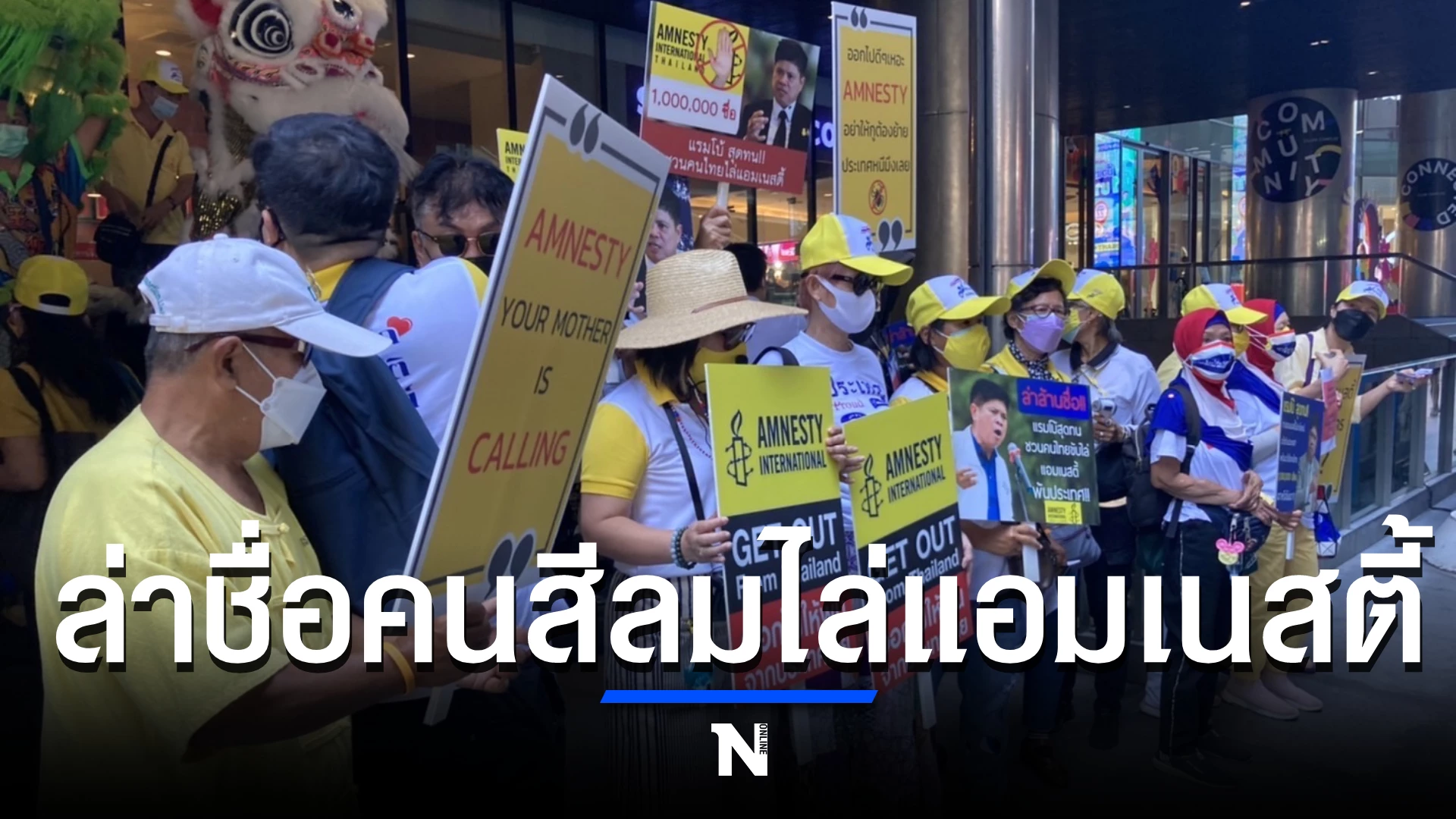 วันนี้ (29 พ.ย.) ที่บริเวณอาคารสีลมคอมเพล็กซ์ กลุ่มพสกนิกรปกป้องสถาบันฯ นำโดย นายนพดล พรหมภาสิต เลขาฯ ศชอ.(ศูนย์ช่วยเหลือด้านกฎหมายผู้ถูกล่วงละเมิด bully ทางสังคมออนไลน์) และ นายอานนท์ กลิ่นแก้ว แกนนำกลุ่มศูนย์รวมประชาชนปกป้องสถาบัน (ศปปส.) นัดหมายจัดกิจกรรมการชุมนุมเดินขบวนขับไล่องค์กร แอมเนสตี้ อินเตอร์เนชั่นแนล ประเทศไทย (Amnesty International Thailand) เบื้องต้นมีผู้ร่วมกิจกรรมประมาณ 50 คน โดยมีการเชิดสิงโต พร้อม ชูป้ายข้อความมีเนี้อหา โจมตี เชิงขับไล่ องค์กรแอมเนสตี้ อินเตอร์เนชั่นแนล ประเทศไทย ให้ออกนอกประเทศไป อาทิ แรมโบ้สุดทนชวนคนไทยไล่แอมแนสตี้