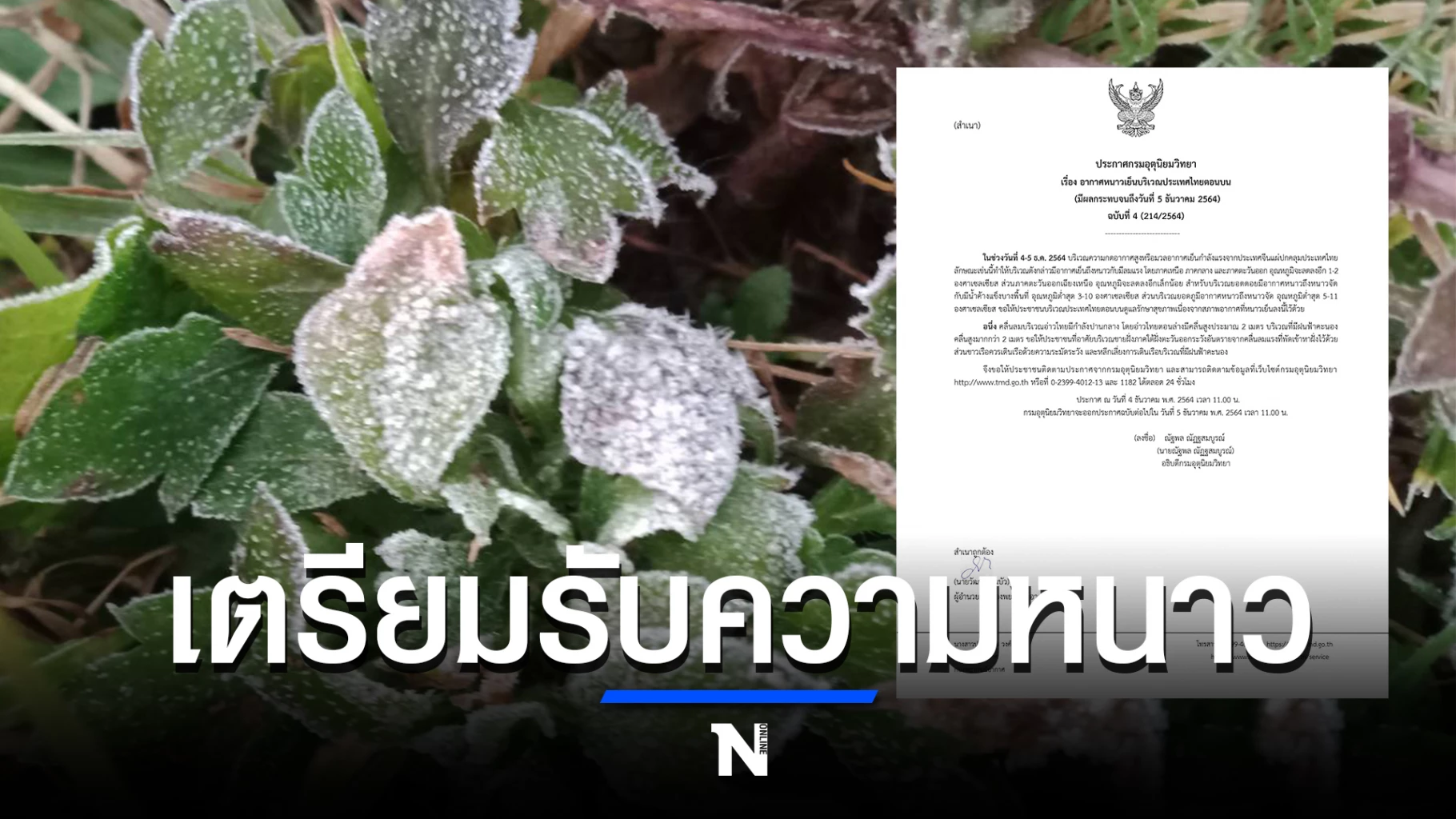 นายณัฐพล ณัฏฐสมบูรณ์ อธิบดีกรมอุตุนิยมวิทยา ออกประกาศกรมอุตุนิยมวิทยา ฉบับที่ 4 ลงวันที่ 4 ธันวาคม 2564 เรื่อง อากาศหนาวเย็นบริเวณประเทศไทยตอนบน มีผลกระทบตั้งแต่วันที่ 4-5 ธันวาคม 2564 มีเนื้อหาดังนี้..