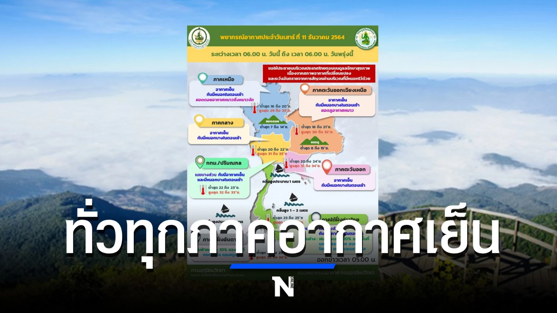 วันนี้ (11 ธ.ค.) กรมอุตุนิยมวิทยา พยากรณ์อากาศประจำวัน พบบริเวณความกดอากาศสูง หรือมวลอากาศเย็นกำลังปานกลางที่ปกคลุมประเทศไทย มีกำลังอ่อนลง แต่ยังคงทำให้มีอากาศเย็นโดยทั่วไป กับมีหมอกในตอนเช้า สำหรับยอดดอยมีอากาศหนาวถึงหนาวจัด อุณหภูมิต่ำสุด 7-14 องศาเซลเซียส และยอดภูมีอากาศหนาว อุณหภูมิต่ำสุด 8-15 องศาเซลเซียส ขอให้ประชาชนบริเวณประเทศไทยตอนบนดูแลรักษาสุขภาพเนื่องจากสภาพอากาศที่เปลี่ยนแปลง และระวังอันตรายจากการสัญจรผ่านบริเวณที่มีหมอกไว้ด้วย