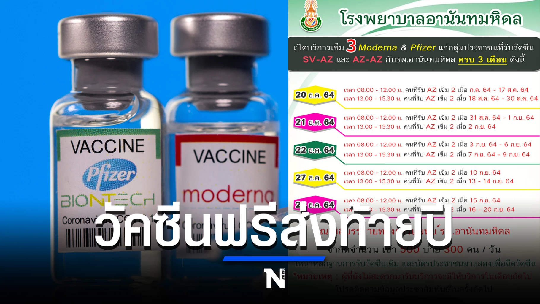 โรงพยาบาลอานันทมหิดล ประกาศวันให้บริการฉีดวัคซีนเข็มกระตุ้น ไฟเซอร์-โมเดอร์นา ส่งท้ายปี 2564 โดยการฉีดรับจำนวนจำกัด
