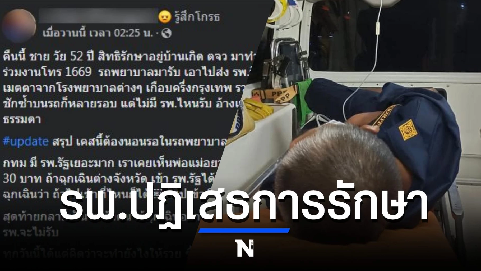 โดยผู้โพสต์ ระบุว่า ชายวัย 52 ปี มีสิทธิ์รักษาอยู่บ้านเกิดต่างจังหวัด มาทำงานเป็น รปภ.ในกรุงเทพวันแรก ป่วยเป็นลมชัก เพื่อนร่วมงานโทร 1669 รถพยาบาลมารับ เอาไปส่ง รพ.รัฐ ไม่มีที่ไหนรับ เจ้าหน้าที่บนรถตระเวนถามขอความเมตตาจากโรงพยาบาลต่างๆ เกือบครึ่งกรุงเทพ รวมทั้งจังหวัดข้างเคียง เนื่องจากคนไข้อยู่บนรถมา 3 ชั่วโมงแล้ว ชักซ้ำบนรถก็หลายรอบ แต่ไม่มี รพ.ไหนรับ อ้างแต่เตียงเต็ม นี่ไม่ใช่เคสแรก แต่เป็นแบบนี้จนกลายเป็นเรื่องธรรมดา