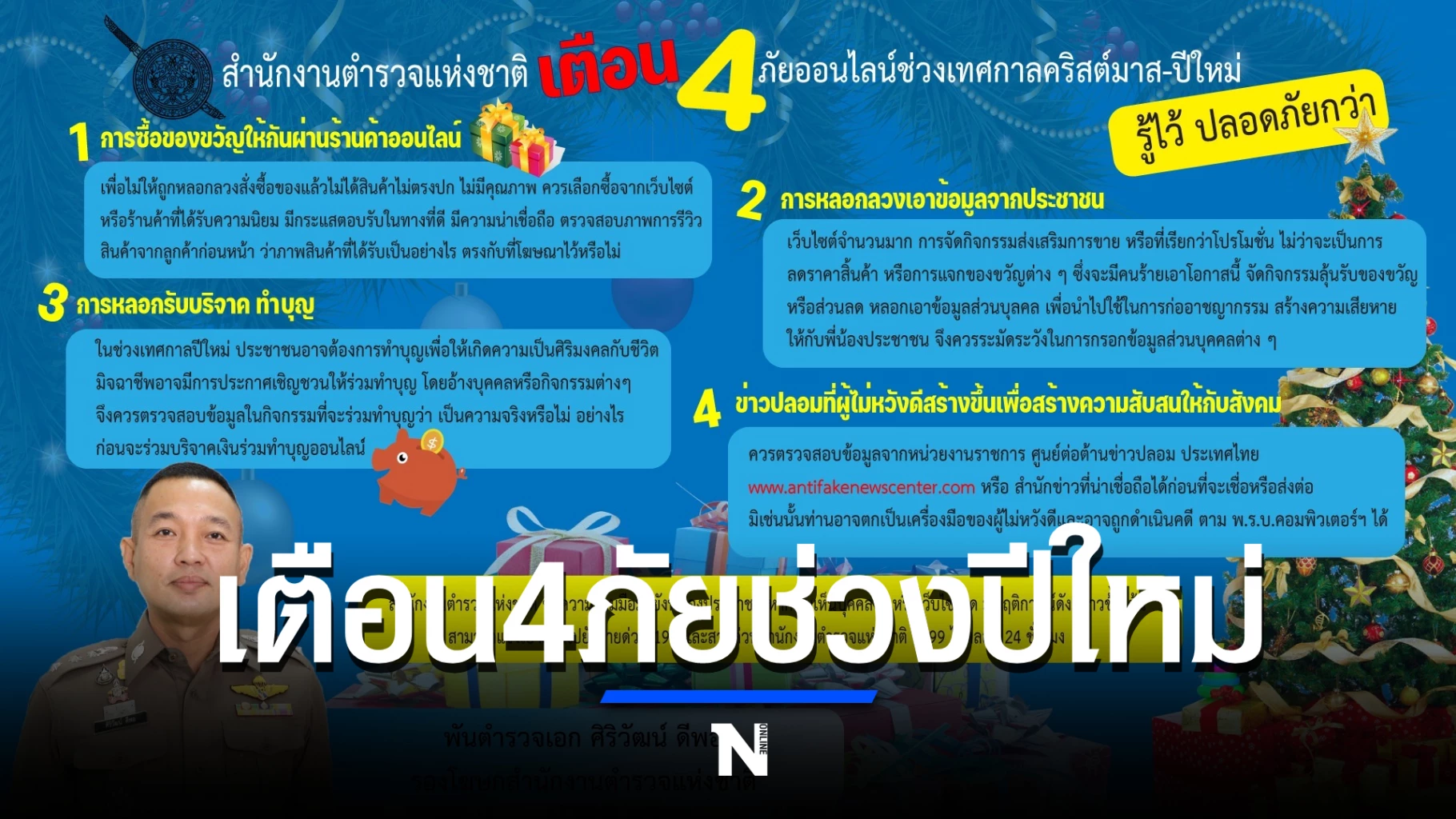 วันนี้ (25 ธ.ค.) พ.ต.อ.ศิริวัฒน์ ดีพอ รอง ผบก.ปอท. ในฐานะรองโฆษกสำนักงานตำรวจแห่งชาติ แจ้งเตือนประชาชน ว่า ในช่วงเทศกาลวันคริสต์มาสและวันขึ้นปีใหม่ที่ใกล้จะมาถึง ตร. มีความห่วงใยเกี่ยวกับแก๊งมิจฉาชีพที่อาจใช้ช่องทางในโลกออนไลน์ ก่ออาชญากรรมผ่านสื่อสังคมออนไลน์ หรือ เว็บไซต์ต่างๆ หลอกลวงประชาชน ดังนั้นเพื่อป้องกันไม่ให้ตกเป็นเหยื่อของแก๊งมิจฉาชีพเหล่านั้น ประชาชนควรจะต้องรับรู้และตระหนัก ให้รู้เท่าทันถึงภัยออนไลน์ที่อาจถูกหลอกลวงดังนี้