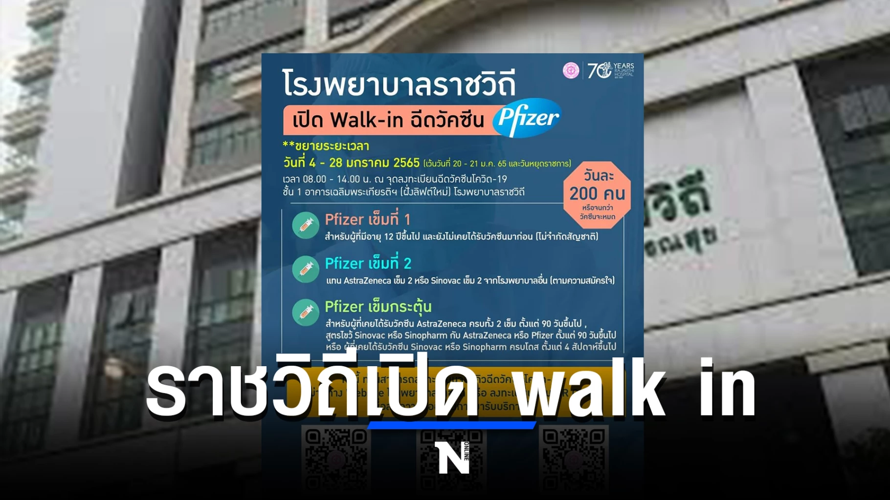 โรงพยาบาลราชวิถี แจ้งข่าวดี ขยายเวลาเปิด Walk in ฉีดวัคซีน ไฟเซอร์ เข็มที่ 1 2 และ 3 วันละ 200 คน หรือจนกว่าวัคซีนจะหมด! กำหนดเริ่มฉีดวัคซีนไฟเซอร์เพื่อสร้างภูมิต้านโควิด-19 ในวันที่ 4 -28 มกราคม 2565 (ยกเว้นวันที่ 20 -21 ม.ค. 65 และวันหยุดราชการ)