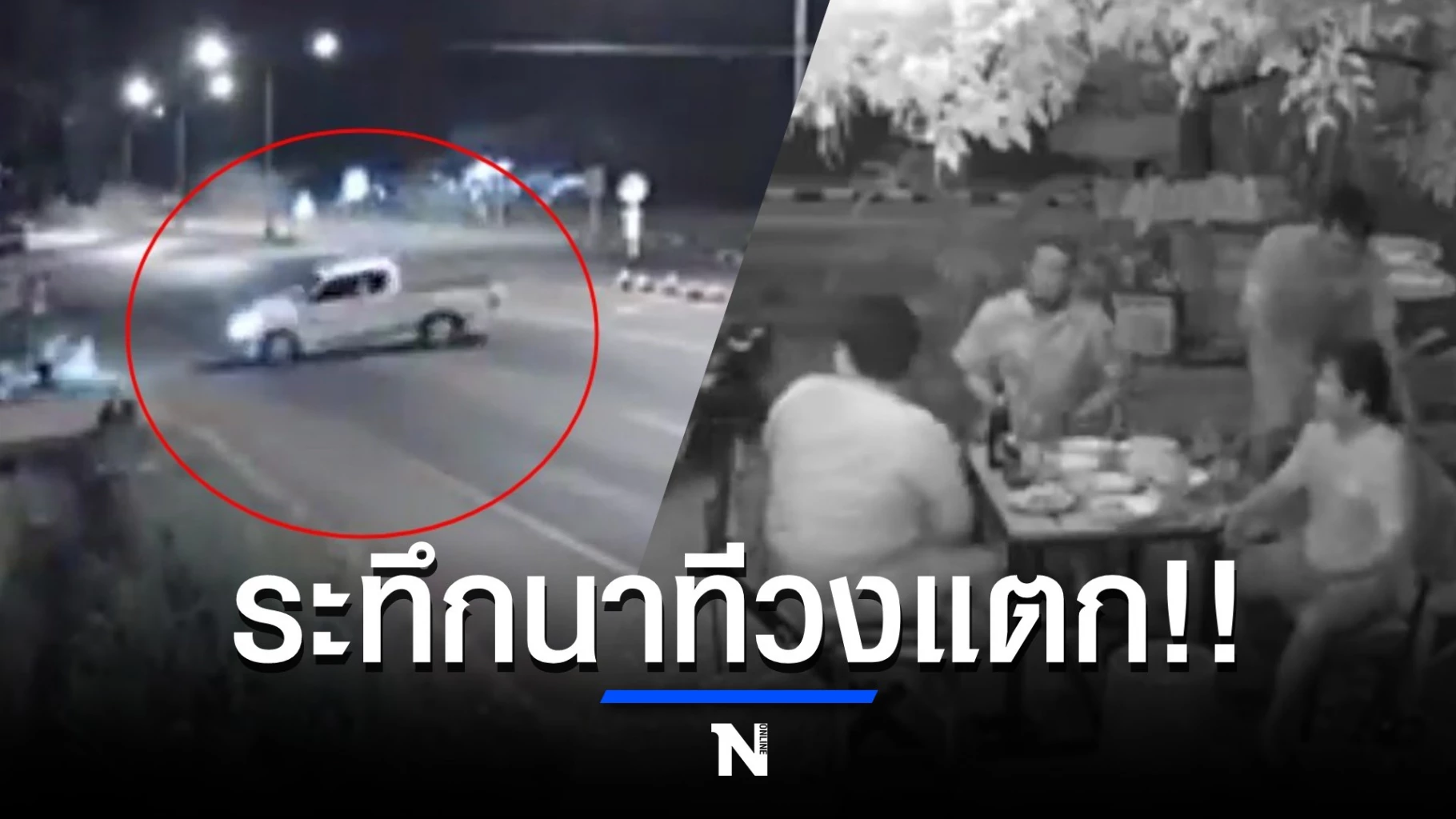 ส่วนภาพอีกมุม จะเห็นช่วงที่กลุ่มชาวบ้าน 4 คน กำลังนั่งดื่มกินตามปกติ เหมือนจะไม่มีอะไรเกิดขึ้น ก่อนที่ทั้งหมดจะได้ยินเสียงดัง และเห็นรถกะบะที่กำลังเสียหลักข้ามฝั่งมา ลักษณะพุ่งเข้ามาหา จนเกิดอาการ “วงแตก” โดยนักดื่ม 3 คน ยอมทิ้งโต๊ะวิ่งหนีออกไป ส่วนอีกคน นั่งขาแข็งด้วยความตกใจ แต่โชคดีที่ตัวรถไหลเข้ามาไม่ถึง
