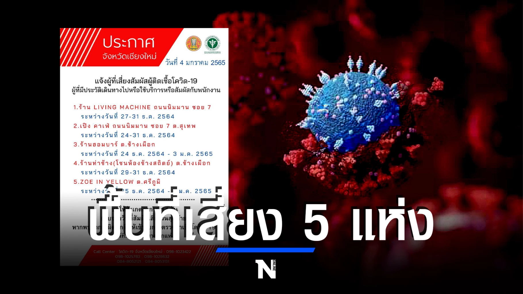 ทั้งนี้จังหวัดเชียงใหม่ขอประกาศสถานที่เสี่ยงเพิ่มอีก 5 แห่ง ซึ่งเป็นสถานบันเทิงทั้งหมด ประกอบด้วย