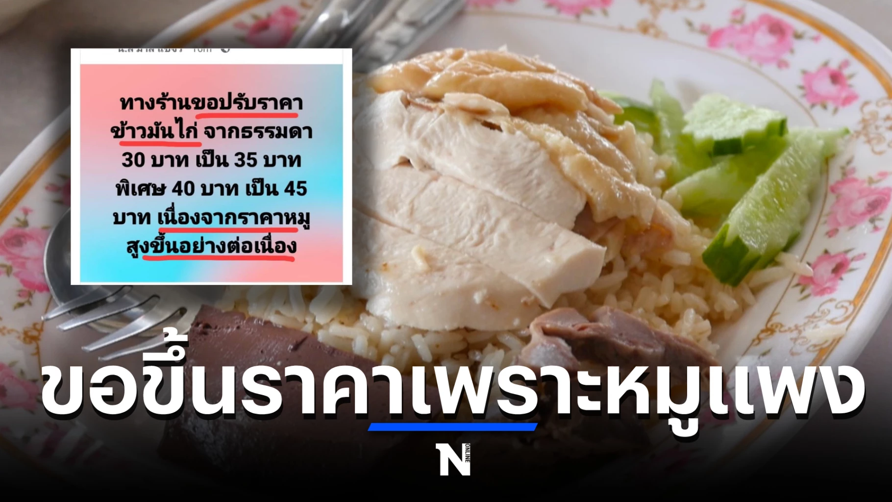 โดยข้อความระบุว่า “ทางร้านขอปรับราคาข้าวมันไก่ จากธรรมดา 30 บาท เป็น 35 บาท พิเศษ 40 บาท เป็น 45บาท เนื่องจากราคาหมู สูงขึ้นอย่างต่อเนื่อง”