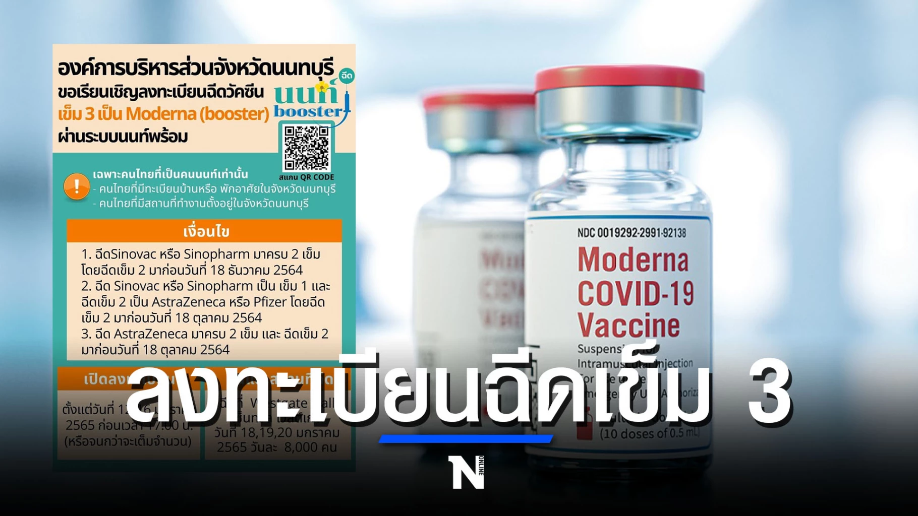 องค์การบริหารส่วนจังหวัดนนทบุรี ขอเรียนเชิญลงทะเบียนฉีดวัคซีน เข็ม 3 เป็น Moderna (booster) booster ผ่านระบบนนท์พร้อม เฉพาะคนไทยที่เป็นคนนนท์เท่านั้น