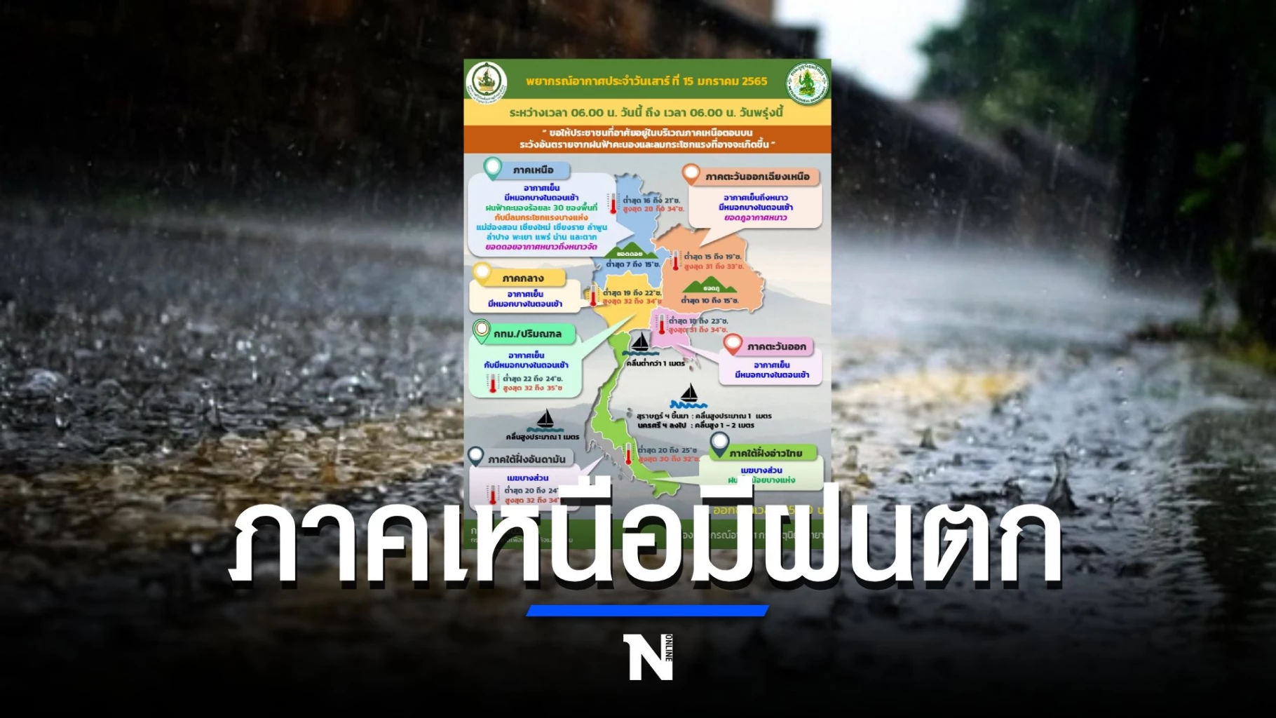 ภาคเหนือ อากาศเย็น กับมีหมอกบางในตอนเช้า โดยมีฝนฟ้าคะนองร้อยละ 30 ของพื้นที่ กับมีลมกระโชกแรงบางแห่ง ส่วนมากบริเวณจังหวัดแม่ฮ่องสอน เชียงใหม่ เชียงราย ลำพูน ลำปาง พะเยา แพร่ น่าน และตาก อุณหภูมิต่ำสุด 16-21 องศาเซลเซียส อุณหภูมิสูงสุด 28-34 องศาเซลเซียส บริเวณยอดดอยอากาศหนาวถึงหนาวจัด อุณหภูมิต่ำสุด 7-15 องศาเซลเซียส ลมตะวันออกเฉียงใต้ ความเร็ว 10-15 กม./ชม.