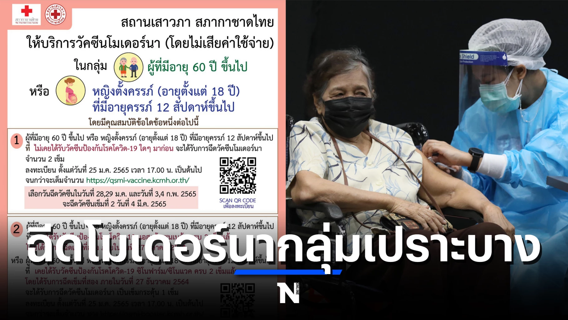 26 มกราคม 2565 สถานเสาวภา สภากาชาดไทย โพสต์ข้อความผ่านเพจเฟซบุ๊ก “สถานเสาวภา สภากาชาดไทย : Queen Saovabha Memorial Institute” เปิดลงทะเบียนเพื่อรับวัคซีนโมเดอร์นา โดยไม่เสียค่าใช้จ่าย ให้กับกลุ่มเปราะบาง ประกอบด้วย ผู้ที่มีอายุ 60 ปี ขึ้นไป หรือ หญิงตั้งครรภ์ (อายุตั้งแต่ 18 ปี) ที่มีอายุครรภ์ 12 สัปดาห์ขึ้นไป โดยผู้ที่สนใจสามารถตรวจสอบรายละเอียด คุณสมบัติข้อใดข้อหนึ่งต่อไปนี้