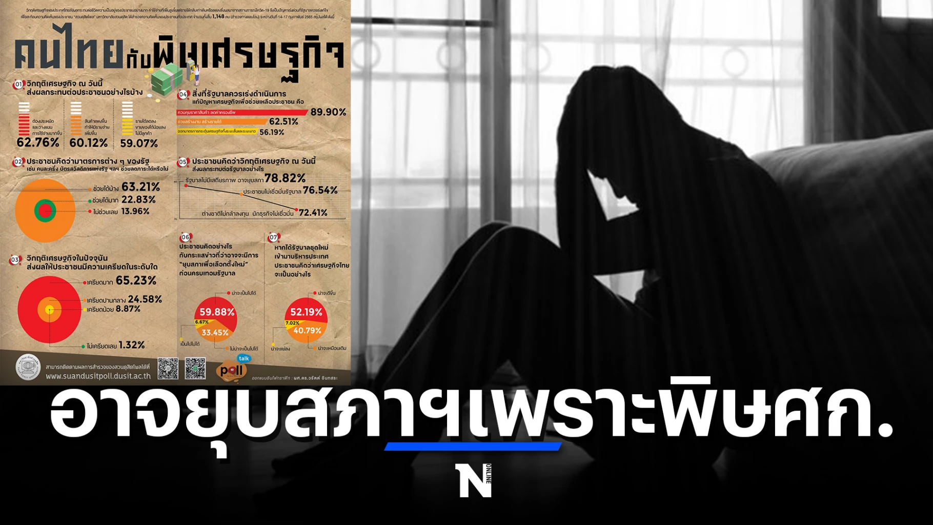 ร้อยละ 63.21 วิกฤตเศรษฐกิจส่งผลให้มีความเครียดในระดับมาก ร้อยละ 65.23 สิ่งที่รัฐบาลควรเร่งดำเนินการคือ ควบคุมราคาสินค้า ลดค่าครองชีพ ร้อยละ 89.90 ปัญหาเศรษฐกิจขณะนี้ทำให้รัฐบาลไม่มีเสถียรภาพ อาจยุบสภา ร้อยละ 78.82 จากข่าว “ยุบสภาเพื่อเลือกตั้งใหม่” น่าจะเป็นไปได้ ร้อยละ 59.88 หากได้รัฐบาลใหม่เข้ามาบริหารประเทศ ประชาชนคิดว่าเศรษฐกิจไทยน่าจะดีขึ้น ร้อยละ 52.19