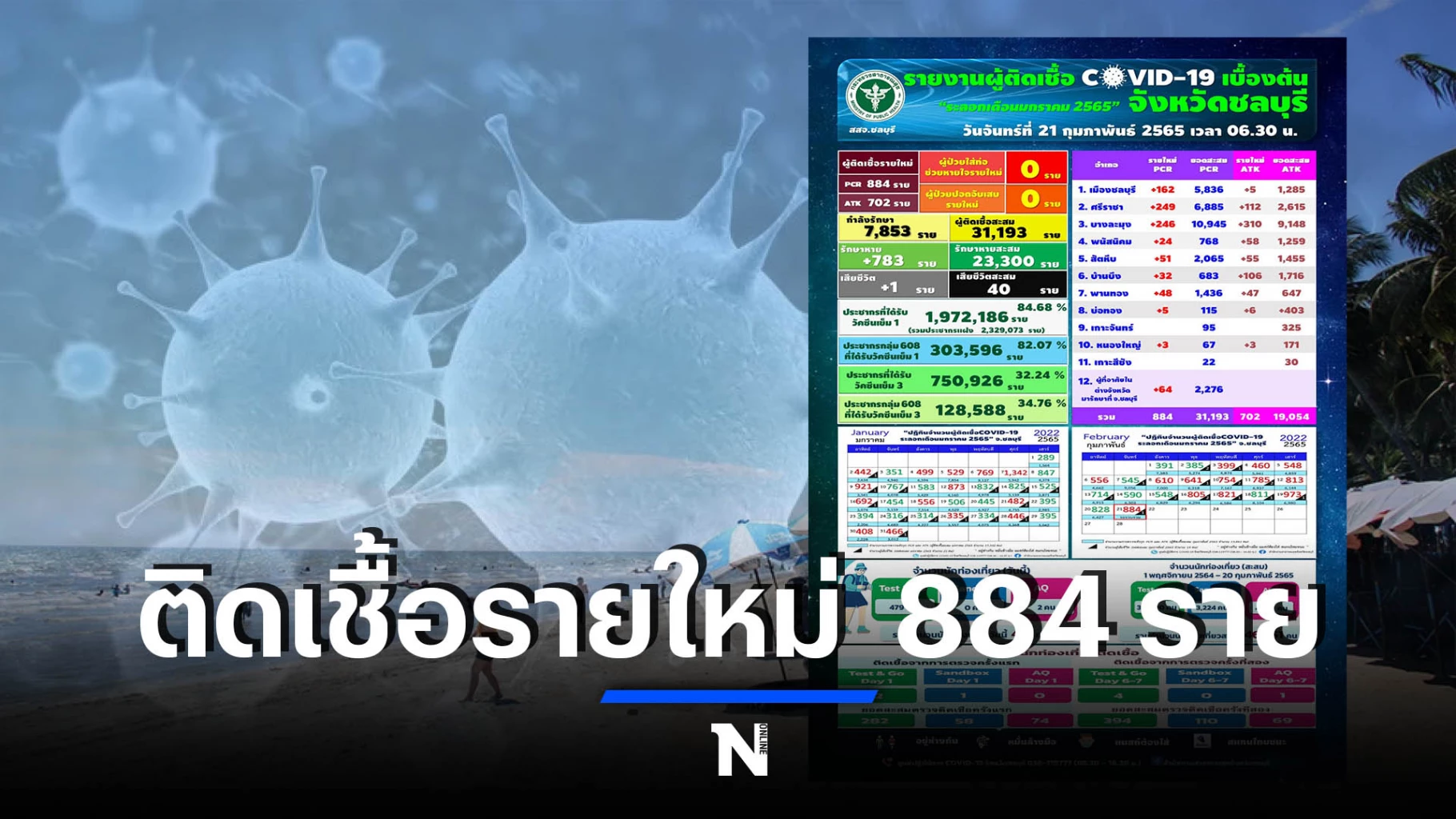 สำนักงานสาธารณสุขจังหวัดชลบุรี สสจ.ชลบุรี รายงานผู้ติดเชื้อโควิด-19 รายใหม่วันนี้ (21 ก.พ. 65) จำนวน 884 ราย