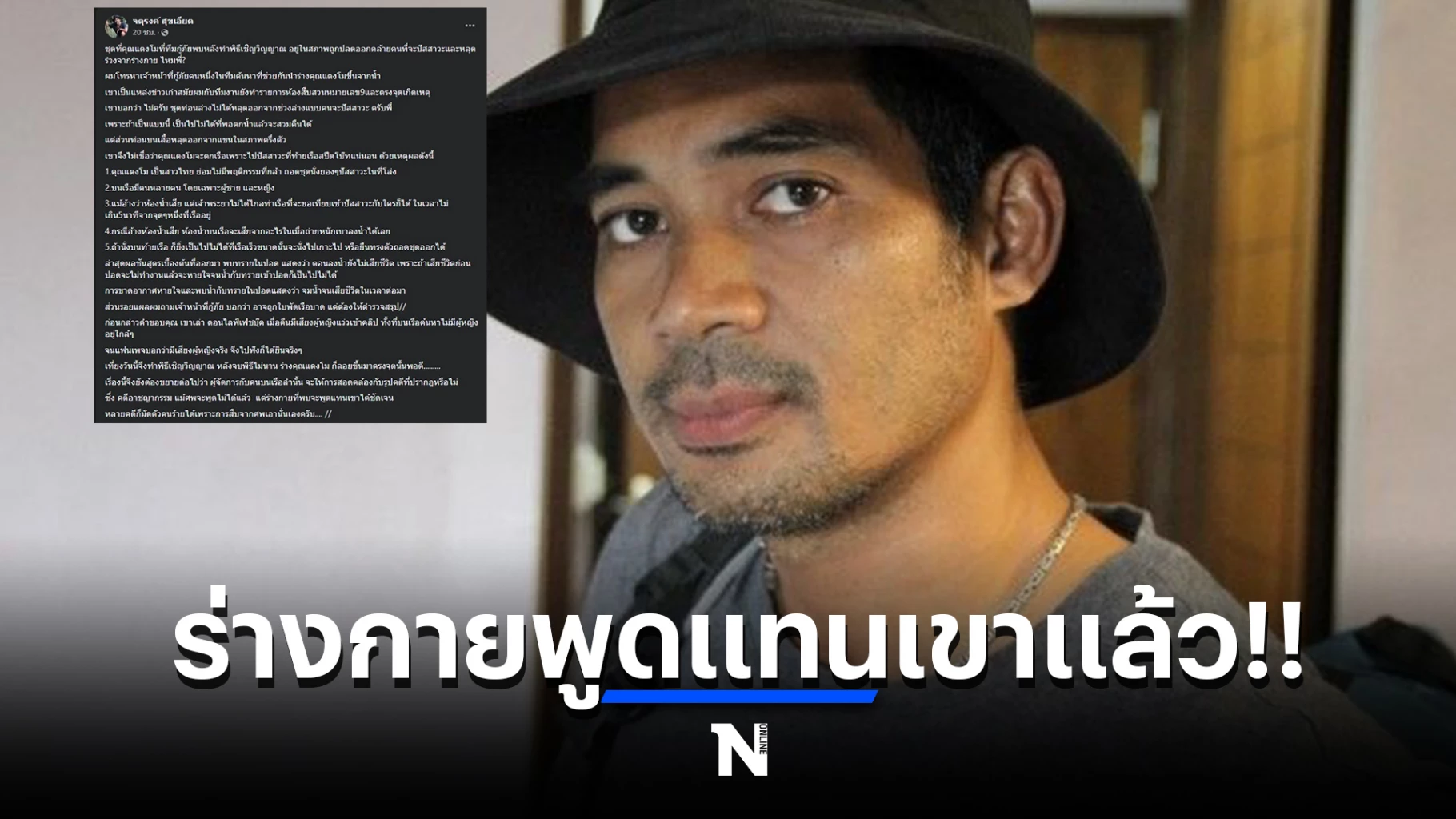 ก่อนกล่าวคำขอบคุณ เขาเล่า ตอนไลฟ์เฟชบุ๊ก เมื่อคืนมีเสียงผู้หญิงแว่วเข้าคลิป ทั้งที่บนเรือค้นหาไม่มีผู้หญิงอยู่ใกล้ๆ จนแฟนเพจบอกว่ามีเสียงผู้หญิงจริง จึงไปฟังก็ได้ยินจริงๆ เที่ยงวันนี้จึงทำพิธีเชิญวิญญาณ หลังจบพิธีไม่นาน ร่างคุณแตงโม ก็ลอยขึ้นมาตรงจุดนั้นพอดี.....เรื่องนี้จึงยังต้องขยายต่อไปว่า ผู้จัดการกับคนบนเรือลำนั้น จะให้การสอดคล้องกับรูปคดีที่ปรากฎหรือไม่ ซึ่งคดีอาชญากรรม แม้ศพจะพูดไม่ได้แล้ว แต่ร่างกายที่พบจะพูดแทนเขาได้ชัดเจน หลายคดีก็มัดตัวคนร้ายได้เพราะการสืบจากศพเอานั่นเองครับ"