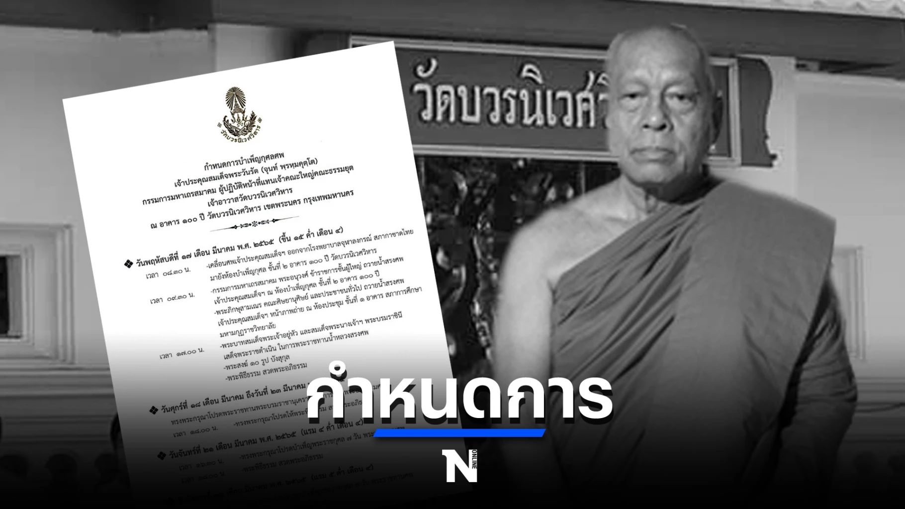 วันนี้(16 มี.ค.65) บรรยากาศภายในวัดบวรนิเวศราชวรวิหาร หลังเจ้าประคุณสมเด็จพระวันรัต อดีตเจ้าอาวาสวัดบวรนิเวศราชวรวิหาร มรณภาพเมื่อวานนี้ สิริอายุ 85 ปี 65 พรรษา จากอาการอาพาธด้วยโรคมะเร็ง โดยวันนี้มีเจ้าหน้าที่จากกองพระราชพิธี สำนักพระราชวัง /สำนักงานเขตพระนคร/ และตำรวจ เริ่มเข้ามาจัดเตรียมสถานที่ภายในวัด เพื่อประกอบพิธีบำเพ็ญกุศลศพสมเด็จพระวันรัต ซึ่งตามกำหนดการในวันพรุ่งนี้ เวลา 09.00น. จะมีการเชิญร่างกลับมายังวัดบวรนิเวศราชวรวิหาร และจะเปิดให้พระเถระ เณร และญาติโยม ได้สรงน้ำศพ ไปจนถึงเวลา 15.00น. ส่วนการบำเพ็ญกุศลยังไม่มีกำหนดการที่แน่ชัด