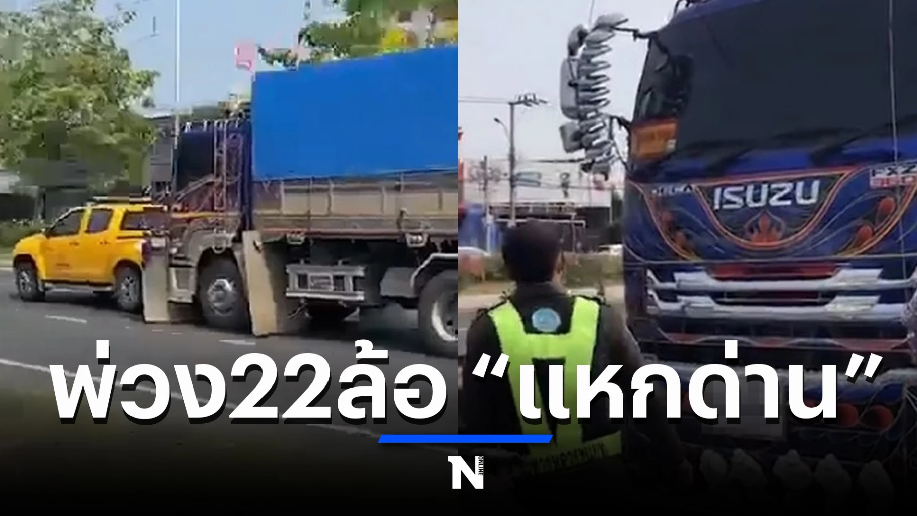 ผู้สื่อข่าวรายงานว่า วานนี้ (16 มี.ค.) ขณะที่เจ้าหน้าที่กรมทางหลวง จะเริ่มตั้งจุดตรวจรถบรรทุกที่มีน้ำหนักเกิน บริเวณถนนนครอินทร์ ตรงข้ามตลาดพระราม 5 ต.บางขุนกอง อ.บางกรวย จ.นนทบุรี พบเห็นรถบรรทุกพ่วง 22 ล้อ ติดฟิล์มดำทึบ วิ่งมาด้วยความเร็ว โดยมีผ้าใบปิดคลุมบริเวรด้านท้ายอย่างมิดชิด "ซิ่งแหกด่าน"