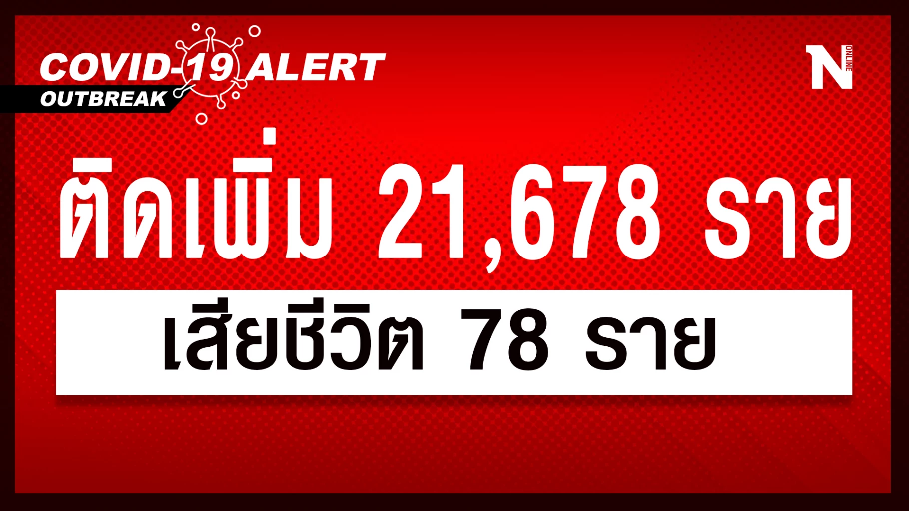 โควิด-19 วันนี้ ยอดลดลงต่อเนื่อง ผู้ติดเชื้อใหม่ 21,678 เสียชีวิต 78 ราย