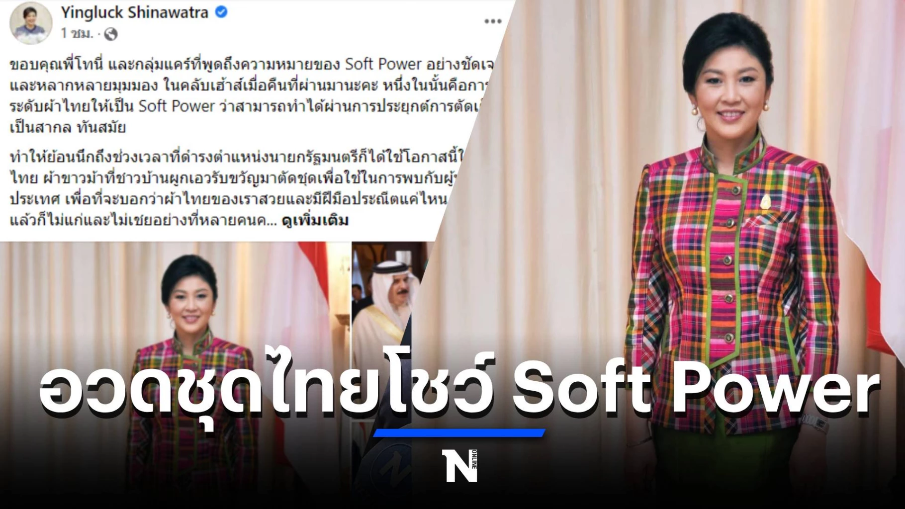 น.ส.ยิ่งลักษณ์ ชินวัตร อดีตนายกรัฐมนตรี โพสต์ข้อความและภาพการสวมใส่ชุดผ้าไทยในโอกาสต่างๆ ในสมัยดำรงตำแหน่งอดีตนายกรัฐมนตรี ผ่านทางโซเชียลมีเดียหลายช่องทางรวมถึงแฟนเพจเฟซบุ๊ก พร้อมระบุข้อความว่า “ขอบคุณพี่โทนี่ หรือ นายทักษิณ ชินวัตร อดีตนายกรัฐมนตรี และกลุ่มแคร์ ที่พูดถึงความหมายของ Soft Power อย่างชัดเจนและหลากหลายมุมมองในคลับเฮาส์เมื่อคืนที่ผ่านมา หนึ่งในนั้นคือการยกระดับผ้าไทยให้เป็น Soft Power ว่าสามารถทำได้ผ่านการประยุกต์การตัดเย็บที่เป็นสากล ทันสมัย”