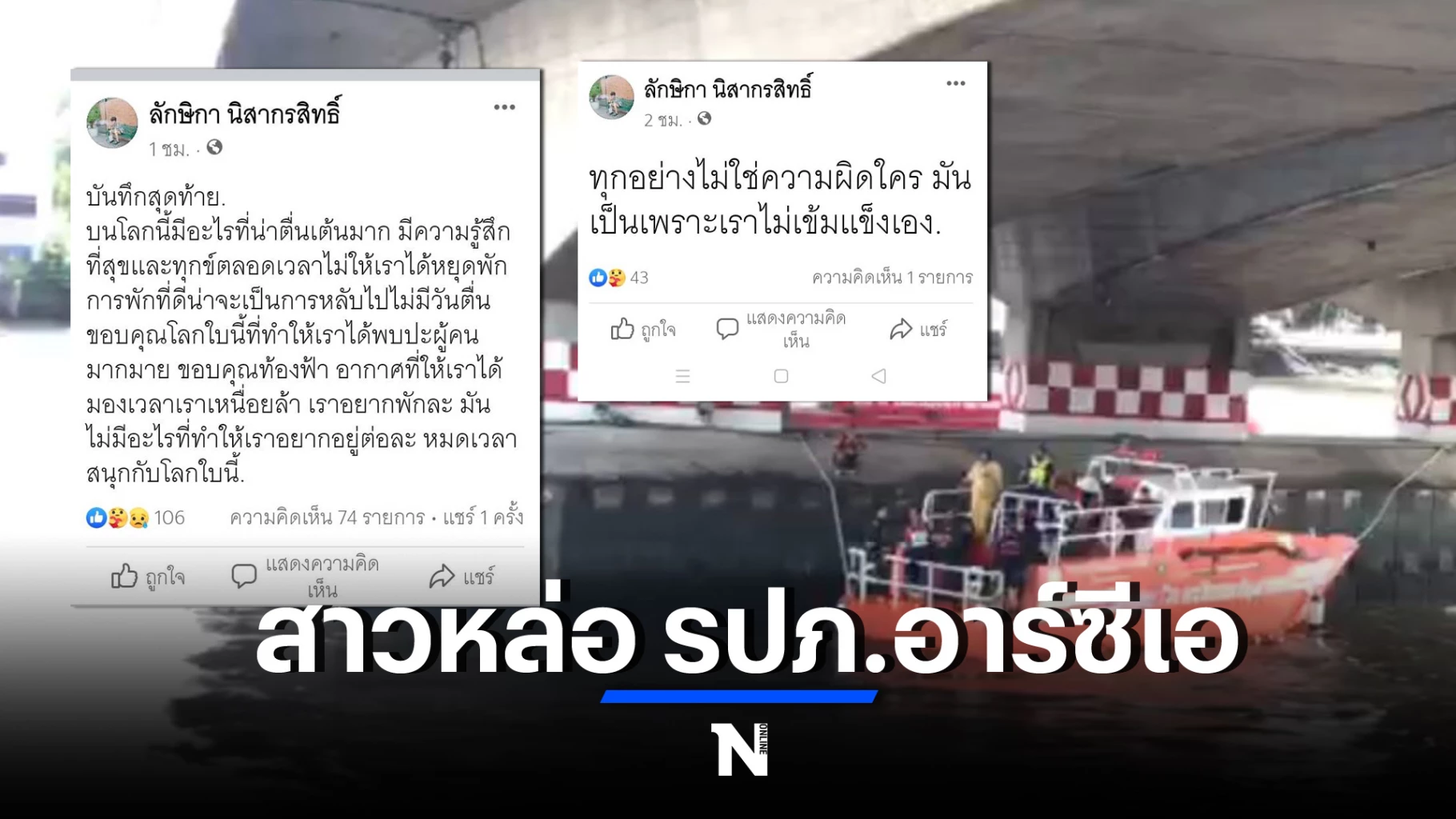 “เมื่อไปดูเฟซบุ๊กส่วนตัวของ น.ส.ลักษิกา ก็พบว่ามีการโพสต์ตัดพ้อน้อยใจโชคชะตาชีวิต ตนจึงรีบเดินทางมาที่เกิดเหตุเห็นเจ้าหน้าที่หลายฝ่ายกำลังช่วยกันพยายามค้นหา เนื่องจากมีผู้เห็นเหตุการณ์ ขณะที่ น.ส.ลักษิกา กระโดดลงน้ำไปจริง โดยขณะนี้ทางนักประดาน้ำมูลนิธิร่วมกตัญญู ได้นำทีมลงไปดำตรวจหาในแม่น้ำแล้ว 1 รอบ แต่เนื่องจากกระแสน้ำไหลแรงมาก จึงต้องยุติการค้นหาเพื่อความปลอดภัยของผู้ปฏิบัติงาน