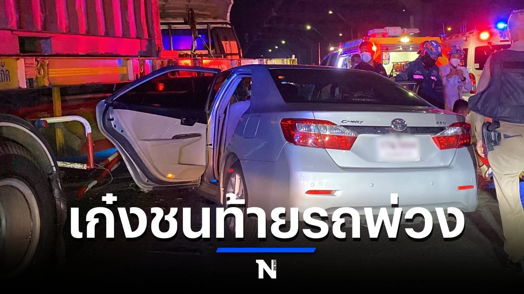 ที่เกิดเหตุเป็นช่องทางคู่ขนาน ถนน 2 เลน พบรถยนต์ ยี่ห้อโตโยต้า รุ่นคัมรี่ สีเทา หมายเลขทะเบียน 1 กฉ 5684 กทม.สภาพหน้ารถพังยับเยิน พุ่งเสยท้ายรถพ่วง 22 ล้อ บรรทุกตู้คอนเทรนเนอร์ หมายเลขทะเบียน 64-5302 กทม.