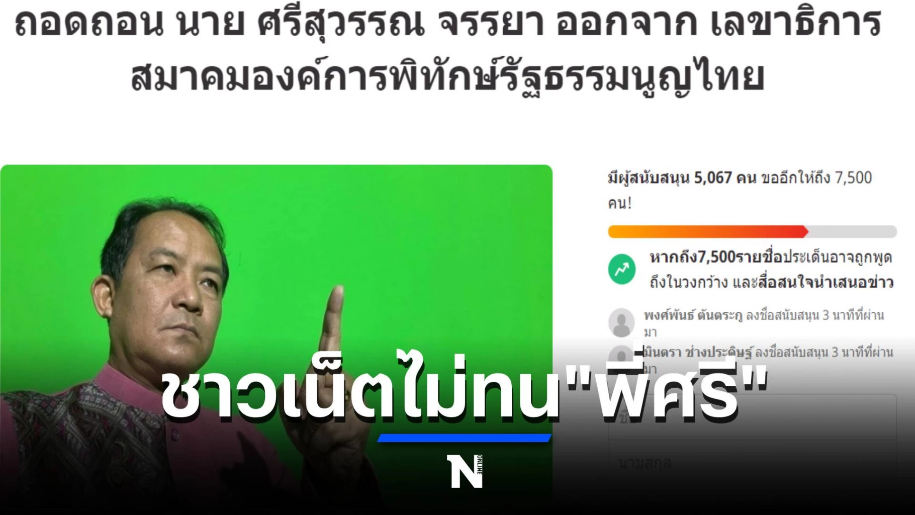 ชาวเน็ตทำแคมเปญผ่าน Change.org เชิญชวนให้ประชาชนโหวตถอดถอน “นายศรีสุวรรณ จรรยา” ออกจากตำแหน่งเลขาธิการสมาคมองค์การพิทักษ์รัฐธรรมนูญไทย หลังร้องเรียนคณะกรรมการการเลือกตั้ง (กกต.) เกี่ยวกับป้ายหาเสียง ซึ่งส่งผลให้ กกต.ยังไม่รับรองผลการเลือกตั้งผู้ว่าฯกทม.ของนายชัชชาติ สิทธิพันธุ์ โดยเลื่อนมาพิจารณาในวันนี้ ซึ่งขณะนี้มีผู้สนับสนุนกว่า 5,000 คน