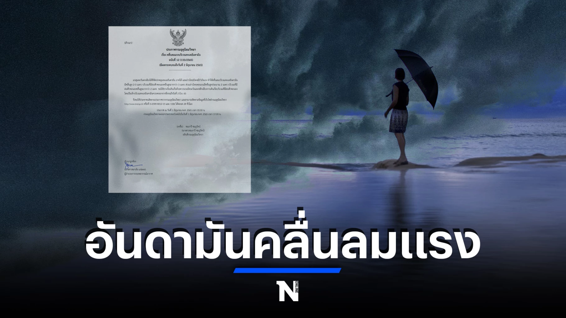 1 มิถุนายน 2565 กรมอุตุนิยมวิทยา ประกาศ "คลื่นลมแรงบริเวณทะเลอันดามัน (มีผลกระทบจนถึงวันที่ 2 มิถุนายน 2565)" ฉบับที่ 12 ลงวันที่ 01 มิถุนายน 2565 ว่า