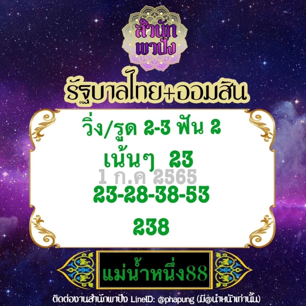 ขณะที่จับตาที่ เลขจากแม่น้ำหนึ่ง ในสำนักพาปัง จะเป็นเลขรัฐบาลไทย และออมสิน จะเน้นไปที่เลข 2 เน้นๆ 23 เลข 2 ตัวได้แก่ 23-28-38-53 และเลข 3 ตัว ได้แก่ 238