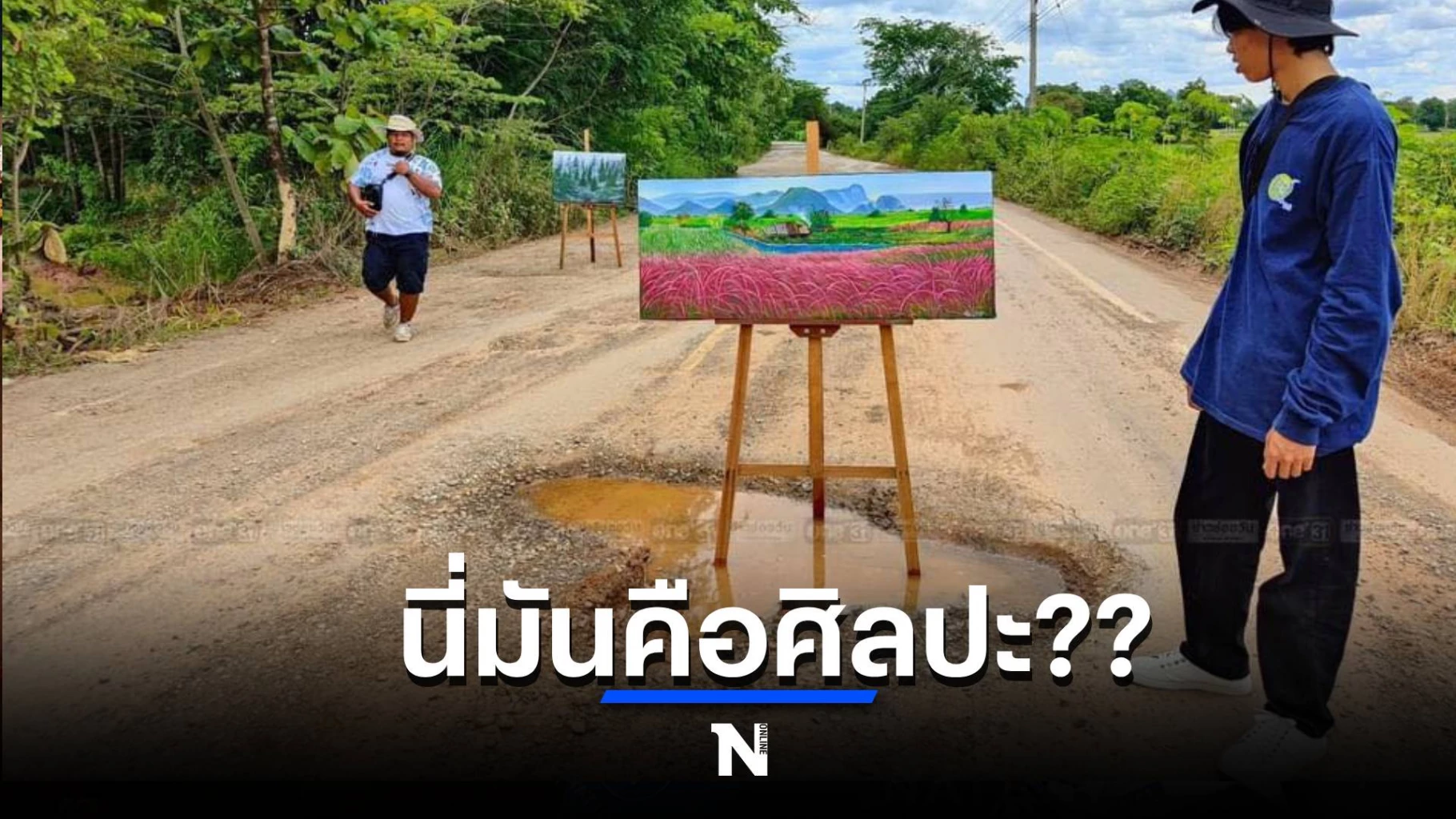 “ศิลปินชาวขอนแก่น” จัดแกลเลอรี่โชว์งานศิลปะบนผิวถนนที่เต็มไปด้วยหลุมบ่อ วอนหน่วยงานเหลียวแล หลังเกิดอุบัติเหตุบ่อยครั้งถึงขั้นมีคนเสียชีวิต